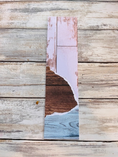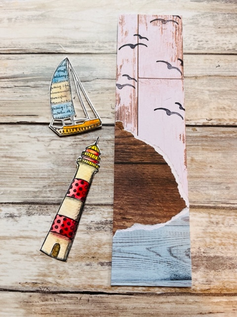 I cut a piece of card into a bookmark shape and covered it with some wood effect scrapbook paper. I wanted to create a kind of seaside/head land effect with this.