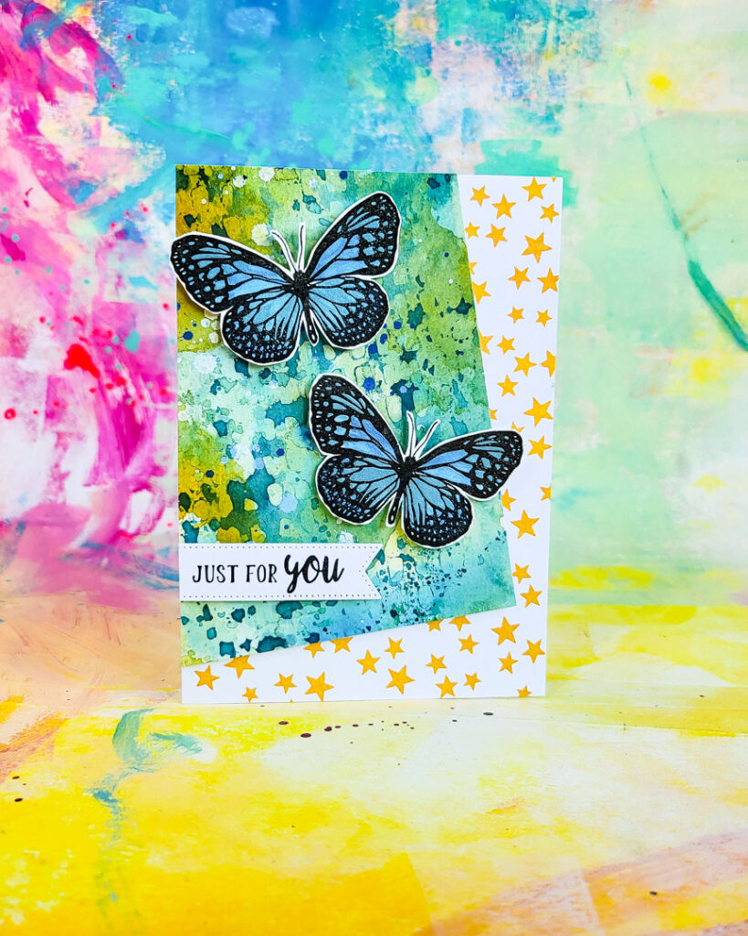 Hi there, Susanne here sharing a happy and bright greeting card with a stencil background using Stars 1 and Marks 3. The focal images are stamps from Butterflies and Moths.