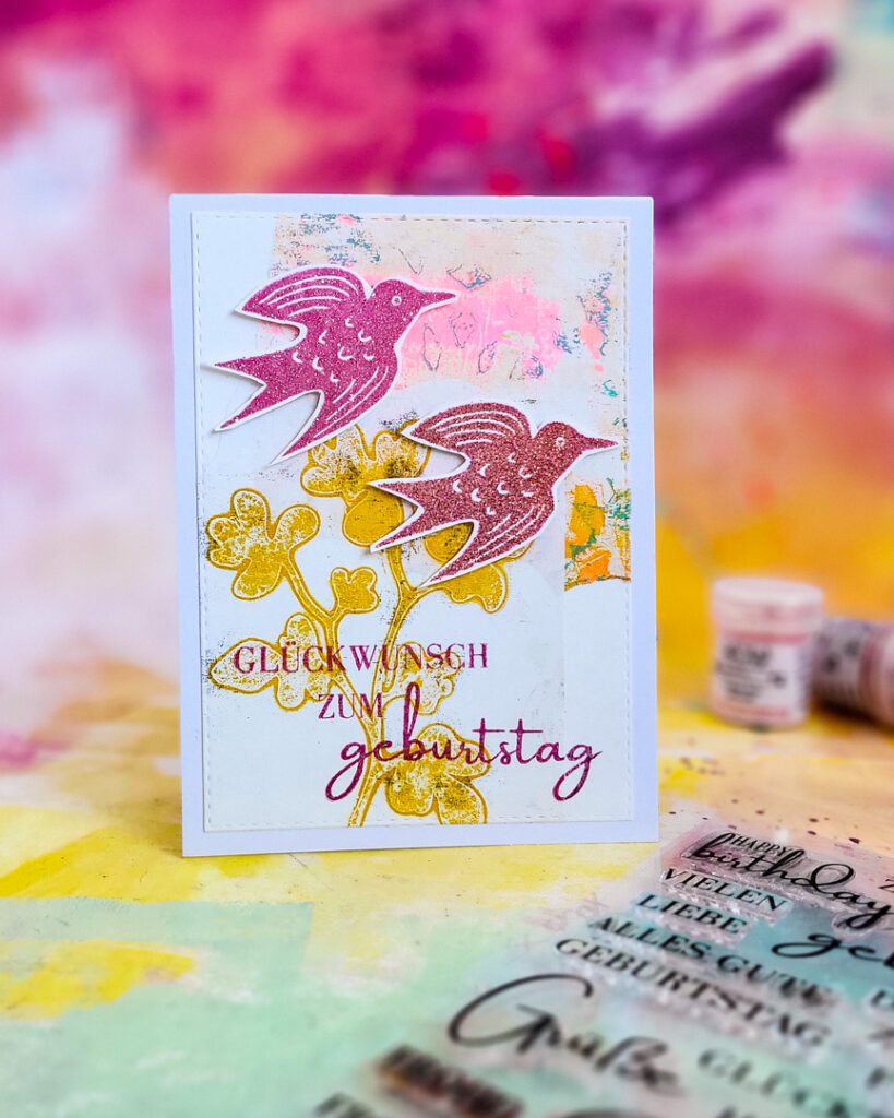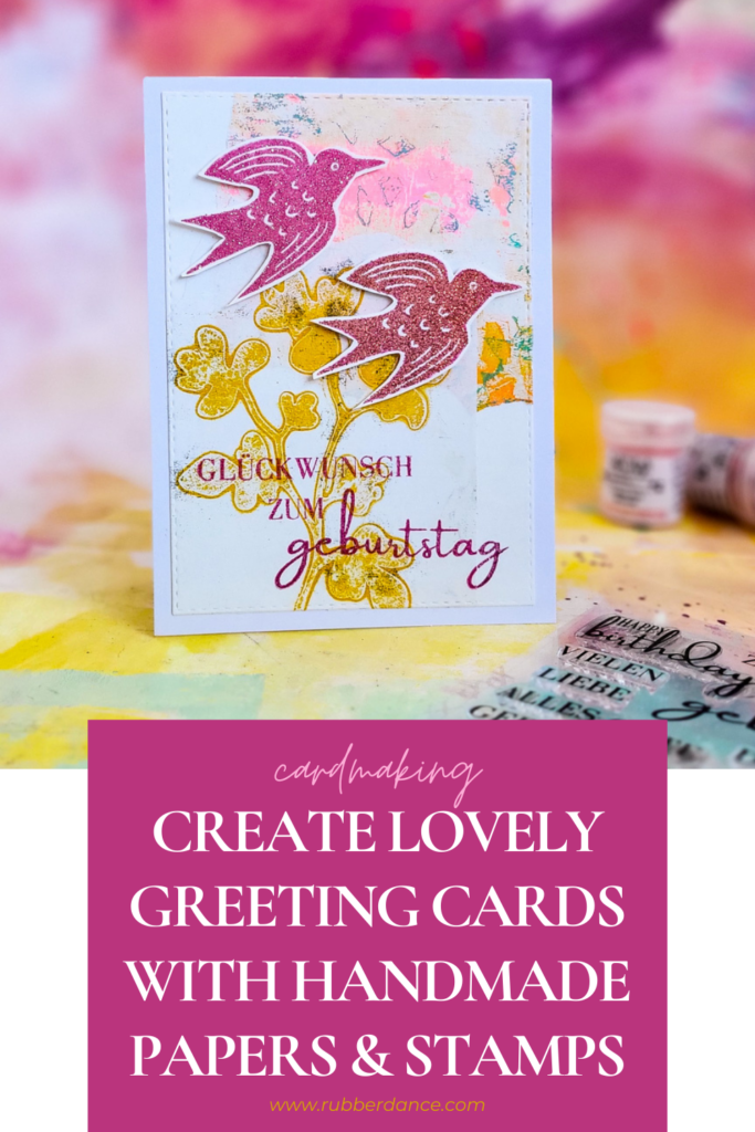 Hi there, Susanne here with a card making project using some of my gelli papers I shared in one of my recent videos, combined with the cute bird from Carved Collection 6 and a greeting from Kartengrüße.