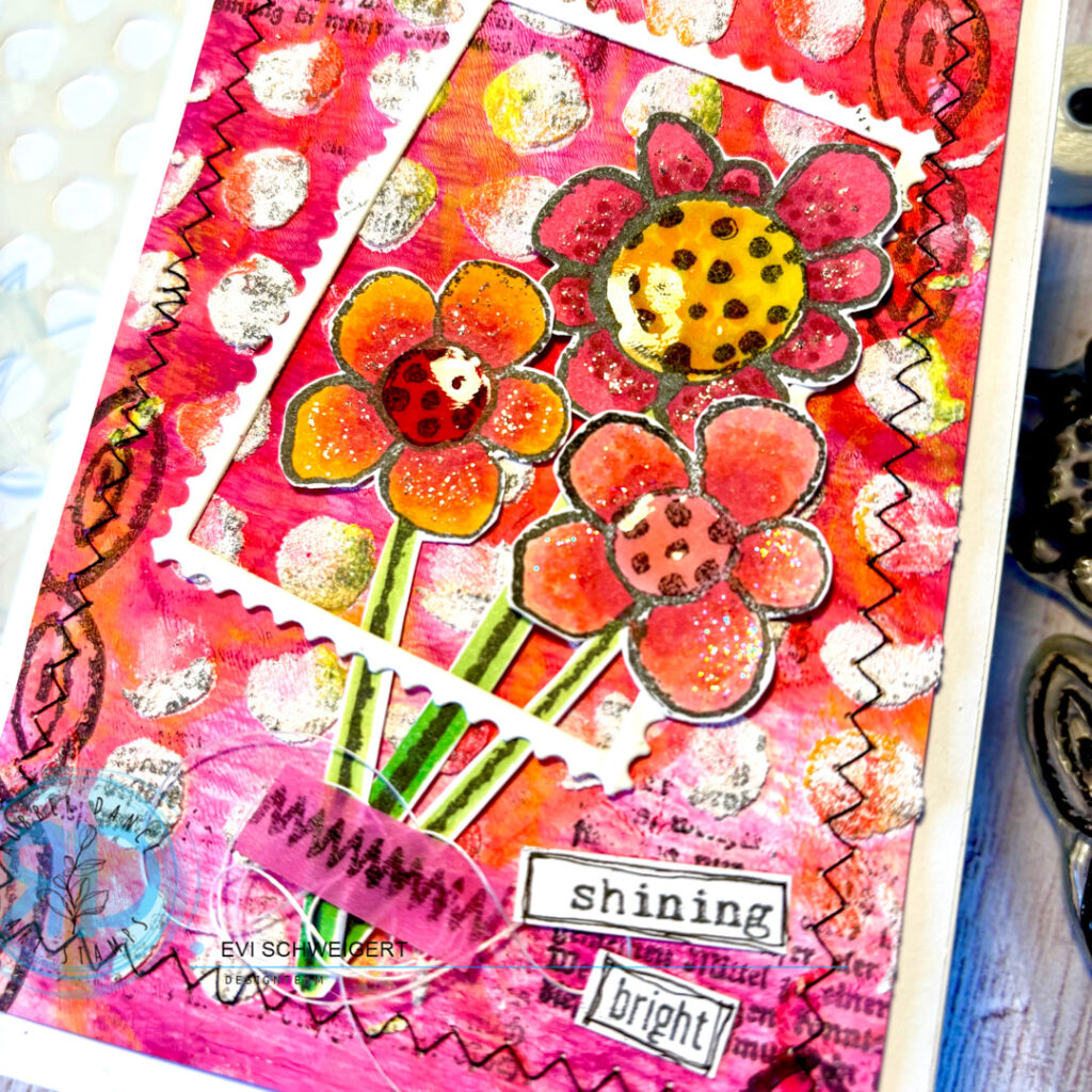 When working with the gelli plate, you often get such great papers that you can also use as a background. So I chose this paper with pink, red and orange colours to apply further textures to it with the Dotted stencil and texture paste. I then selected the flowers from the Pencil Marks 4 stamp set and stamped and coloured them on marker paper. With a little glitter and shiny gloss, the flowers look very classy.