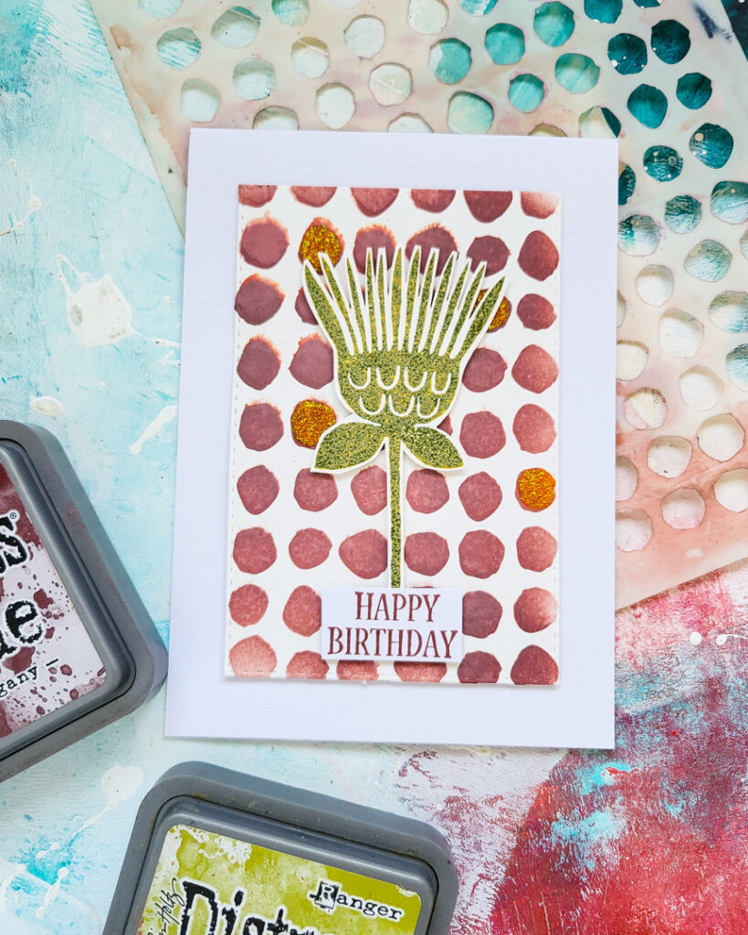 I love making my own papers for cardmaking, scrapbooking or other papercrafts! For today’s card I used our Dotted stencil together with Distress Oxide in Aged Mahagoni. Once I had applied the ink through the stencil I cleaned the stencil, placed it over the pattern again – slightly shifted – and spritzed it with water. The ink will react with the water and you will get a nice glowy effect.