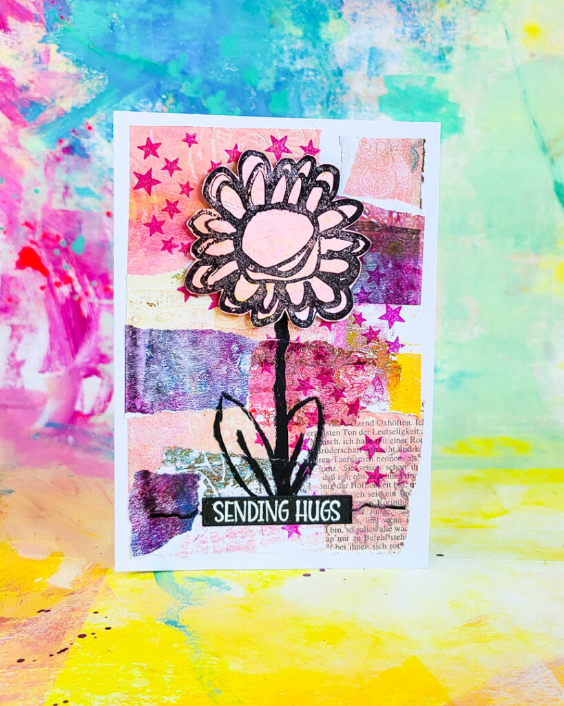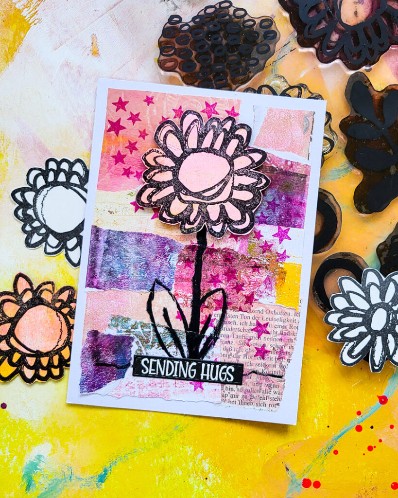 I picked a bunch of gelli paper scraps from my stash to create a patchwork background on the card base. Once glued down, I added some stamping with the stars from Mix It Up 4 in pink to match the background. As my focal image I stamped the big flower from Pencil Marks 7 also to a gelli paper and cut it out. I drew the stem and the leaves with a black Neocolor and adhered the flower with foam dots to give it more dimension.