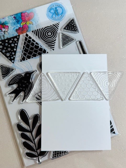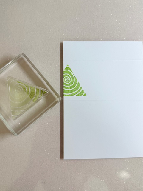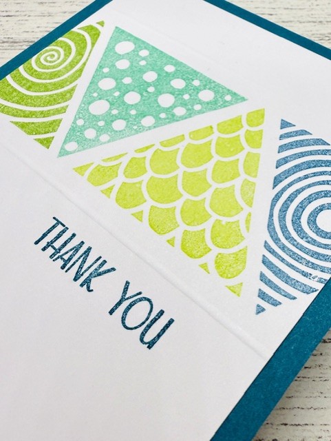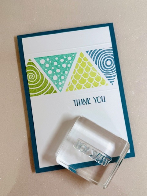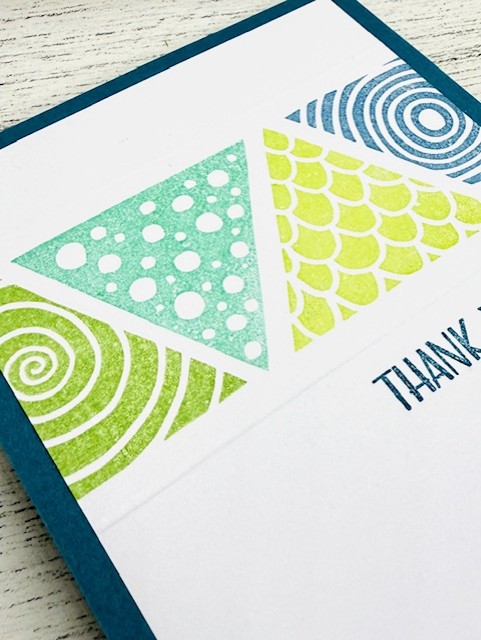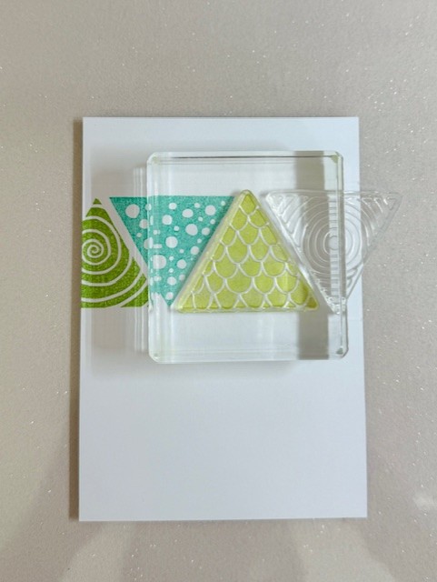 Using blue and green inks, I stamped the 4 triangles in a line.