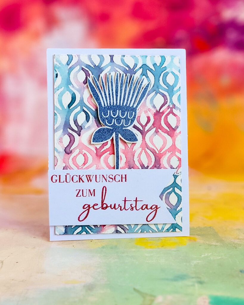Hi there, Susanne here sharing a greeting card with a stencil background using Brusho pigment powders with our Ornament 1 stencil together with a stamp from Carved Collection 6 and a greeting from Kartengrüße.