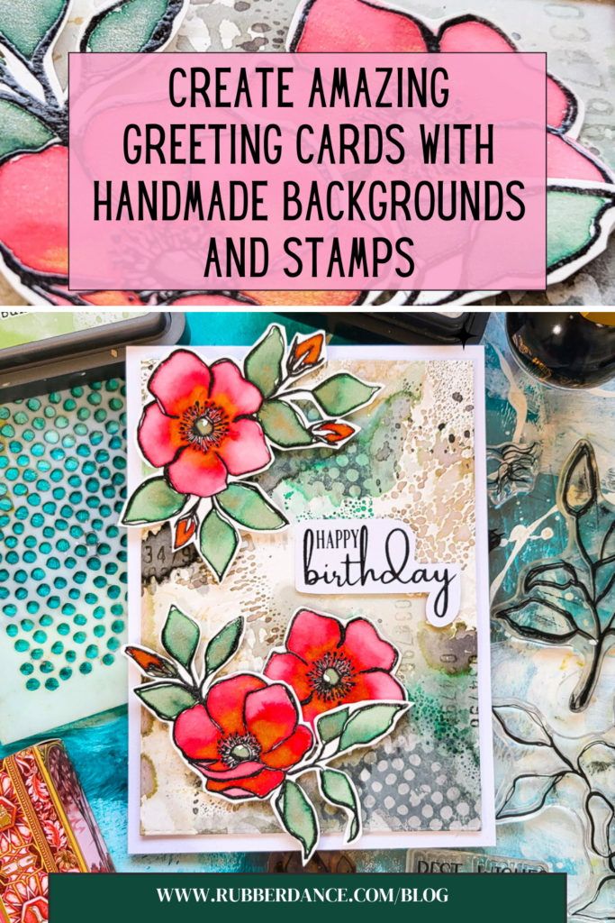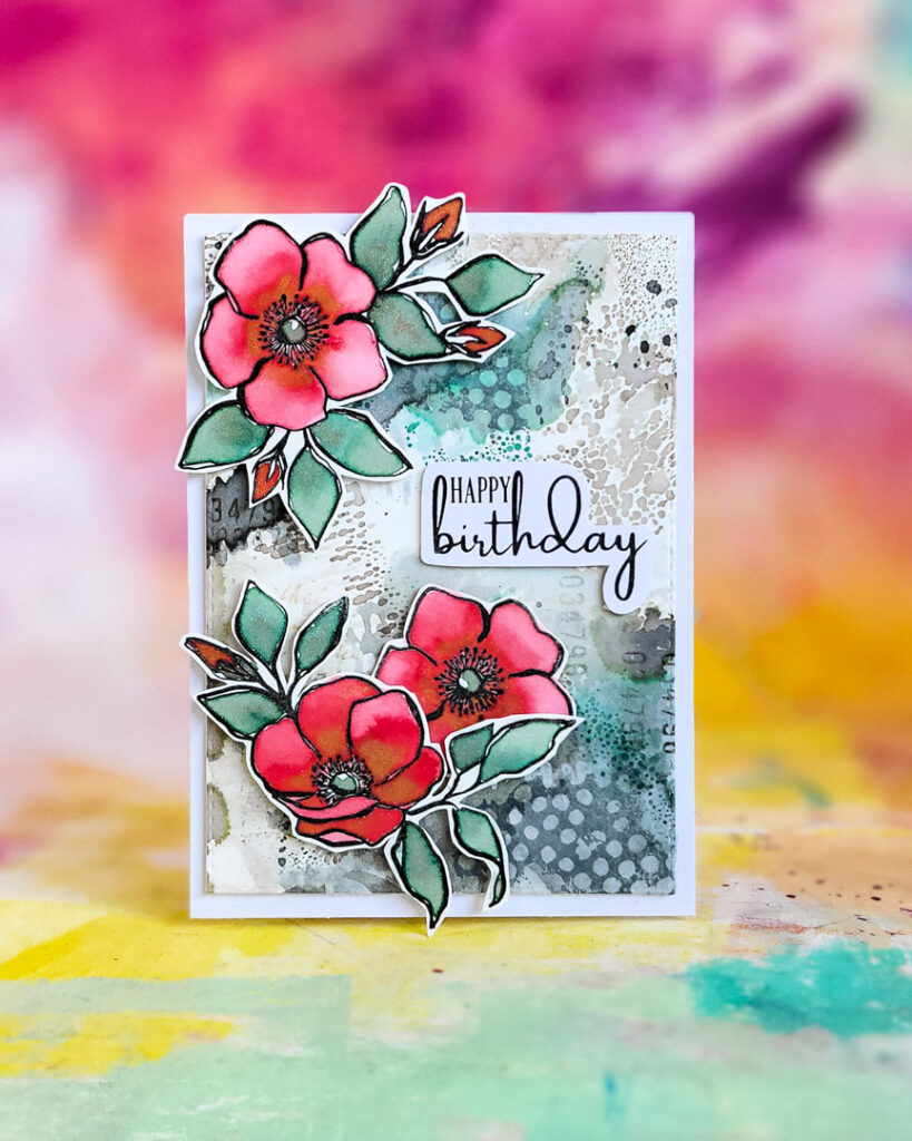 Hi there, Susanne here sharing a greeting card with the Distress Ink backgrounds I shared on Wednesday, stamps from our Inky Flowers set and a greeting from Kartengrüße.
