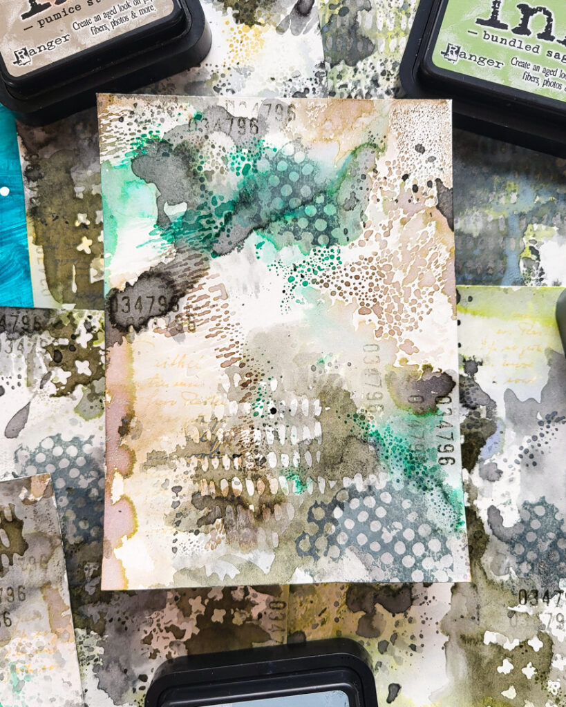 For the backgrounds of these cards I used one of the design papers I created in Wednesday’s post with Distress Inks, Oxides, some stamps and our Mini Marks stencil. I linked the video again at the end of this post!
