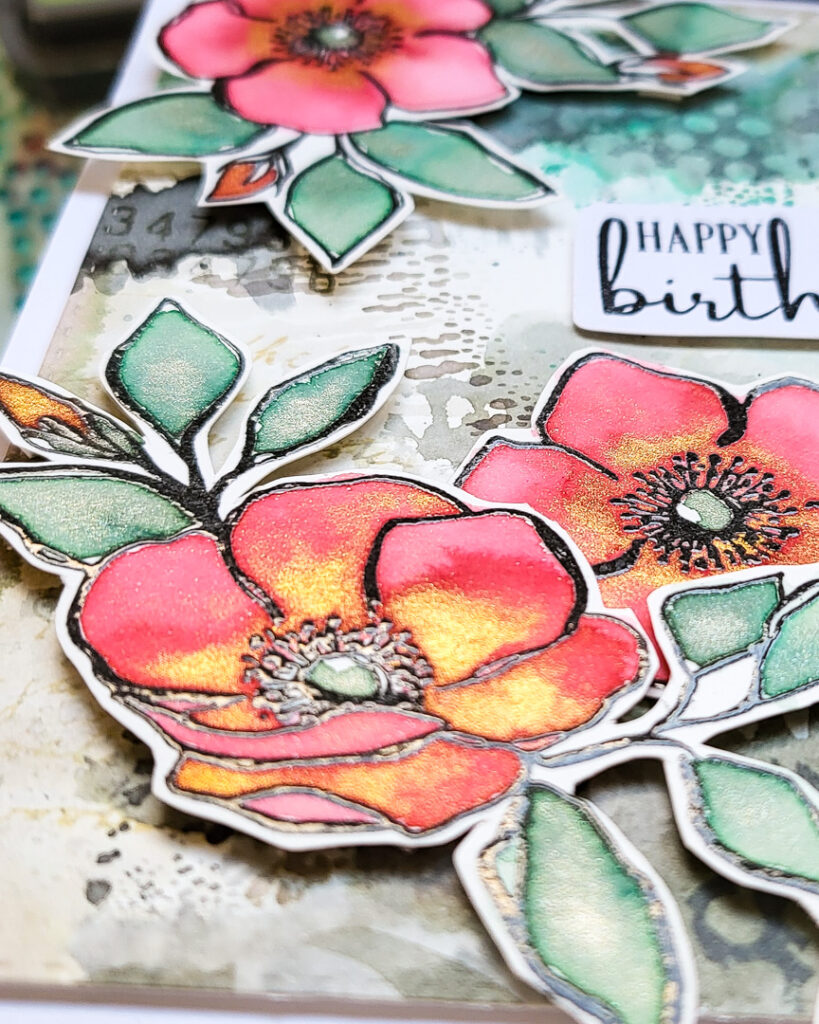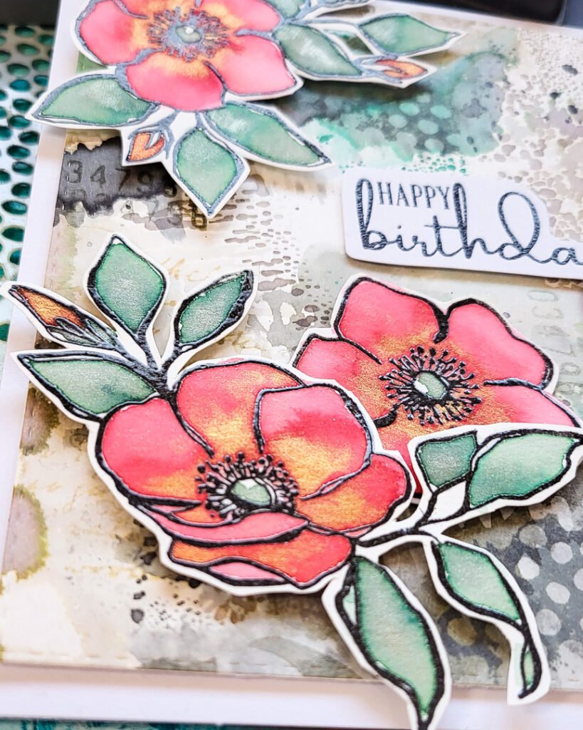 I mounted the paper to a card base and adhered my focal image with foam dots. The flowers from our Inky Flowers are stamped in black with clear embossing powder over the top. I coloured them with some amazing inks from Ferris Wheel Press. Can you see how beautiful the flowers turned out?!