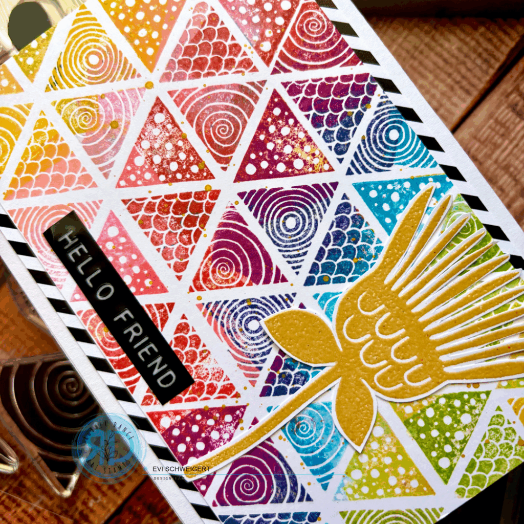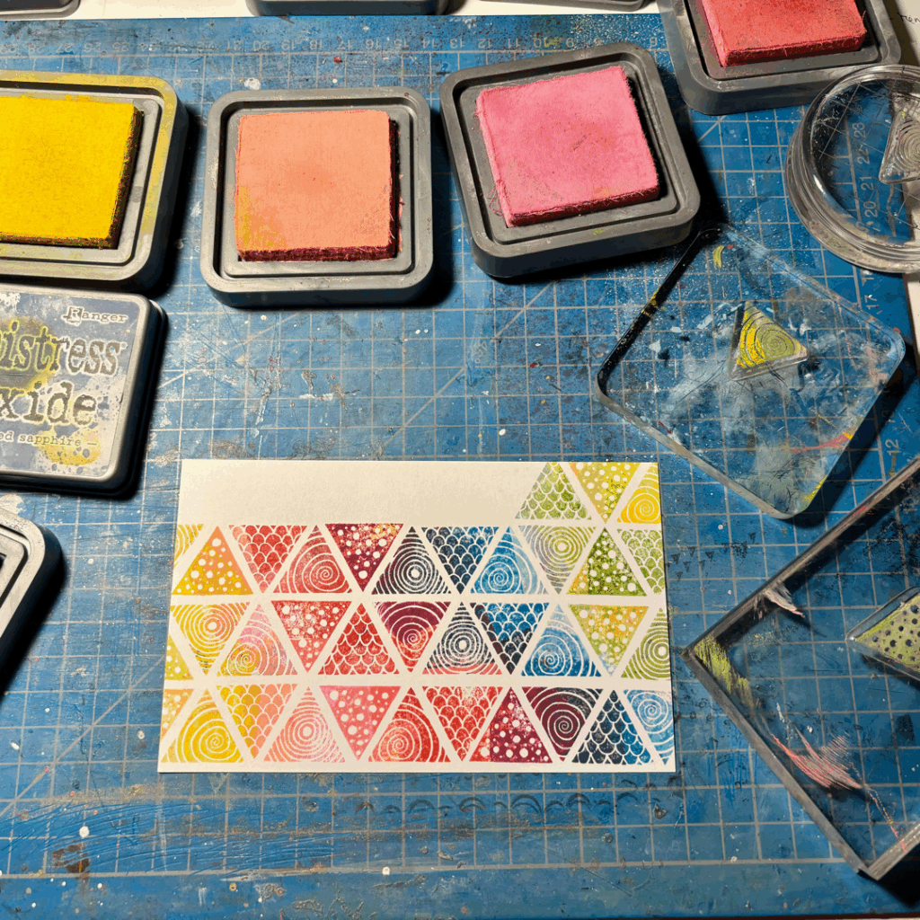 I started by designing the background. To do this, I laid out lots of Distress Oxide ink pads and selected the small triangles from the set Carved Collection 6. It takes a little effort to stamp the paper in a specific color sequence and fairly evenly, but you will be rewarded with a great background in the end.