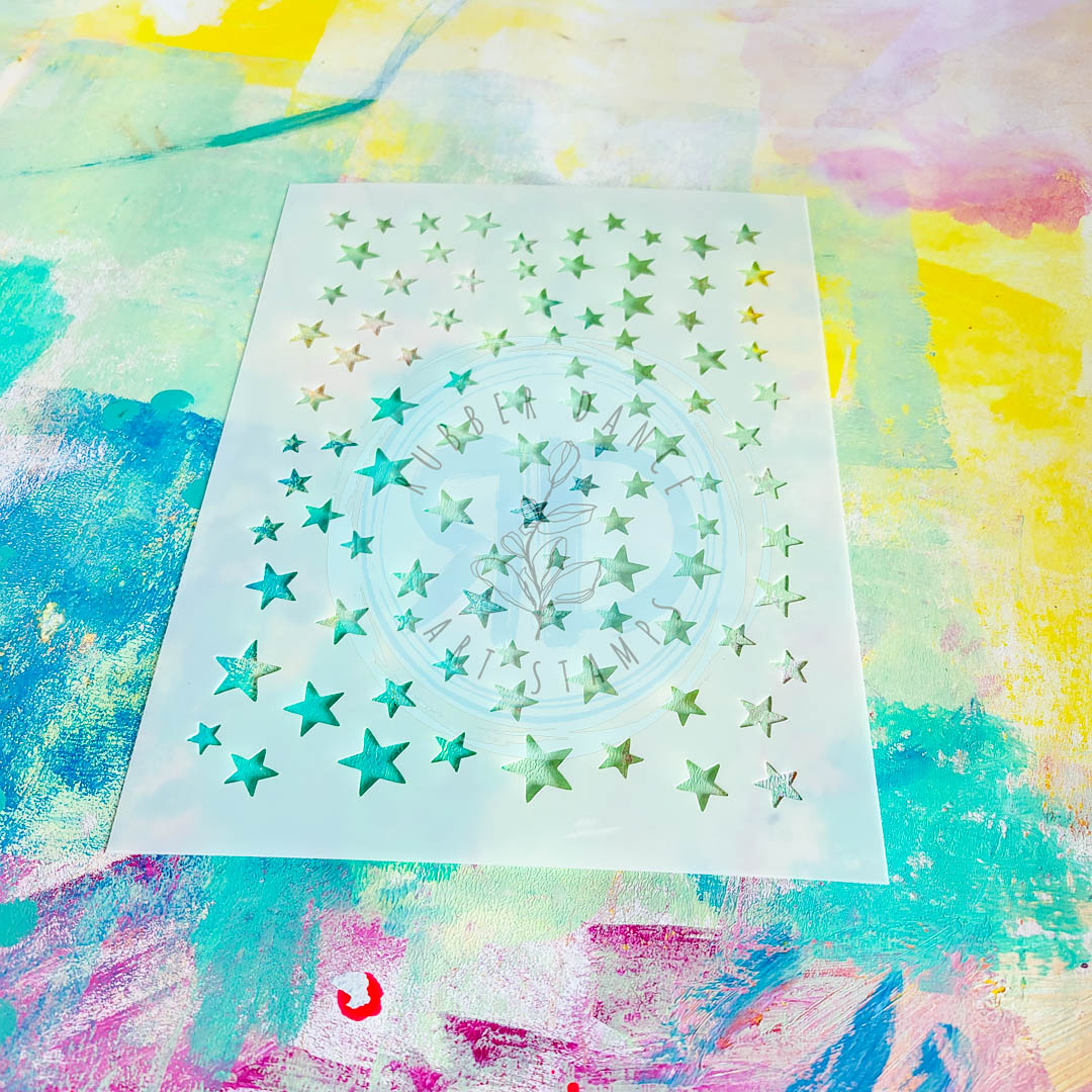 Hi there, Susanne here sharing an autumnal mixed media card using our Stars stencil and a collage cluster made with stamps from our Textured Mushrooms 2.