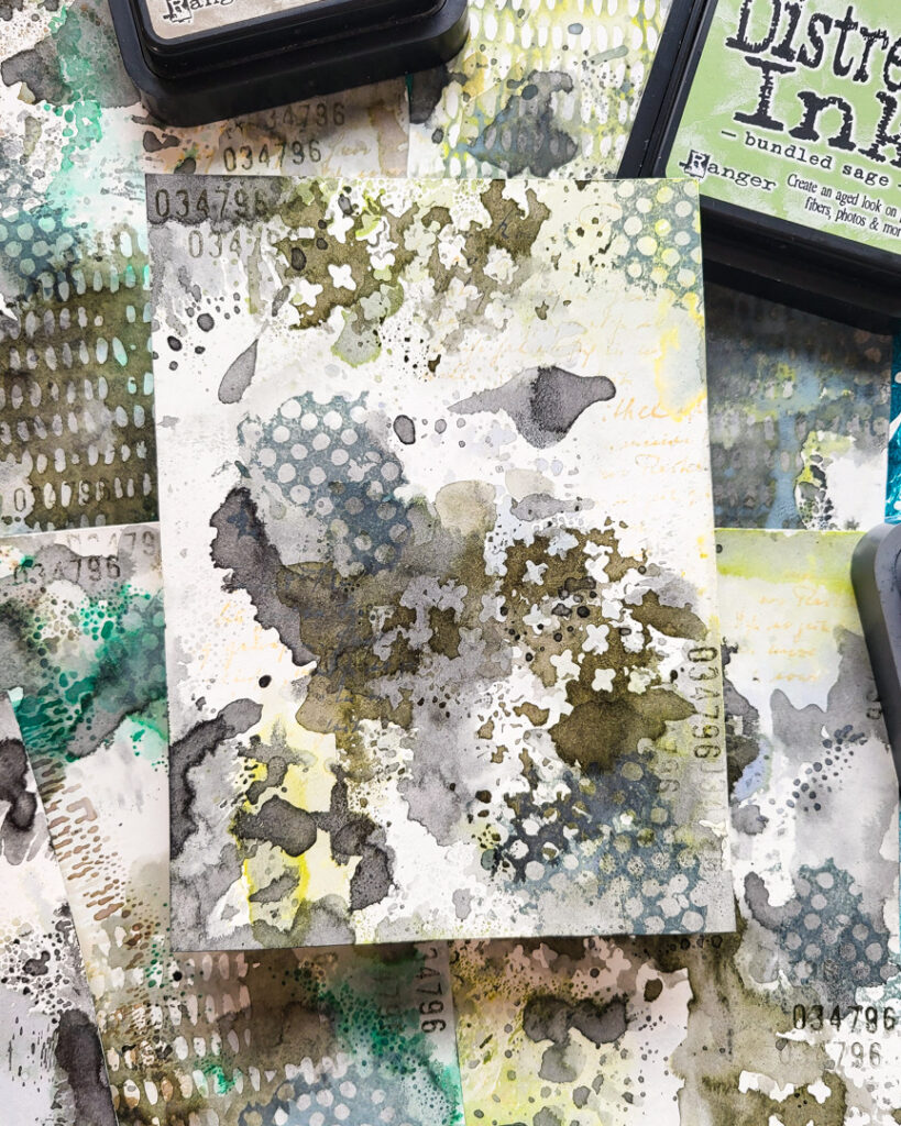 For the backgrounds of these cards I used one of the design papers I created in last week’s post with Distress Inks, Oxides, some stamps and our Mini Ink Dots stencil. I linked the video again at the end of this post!