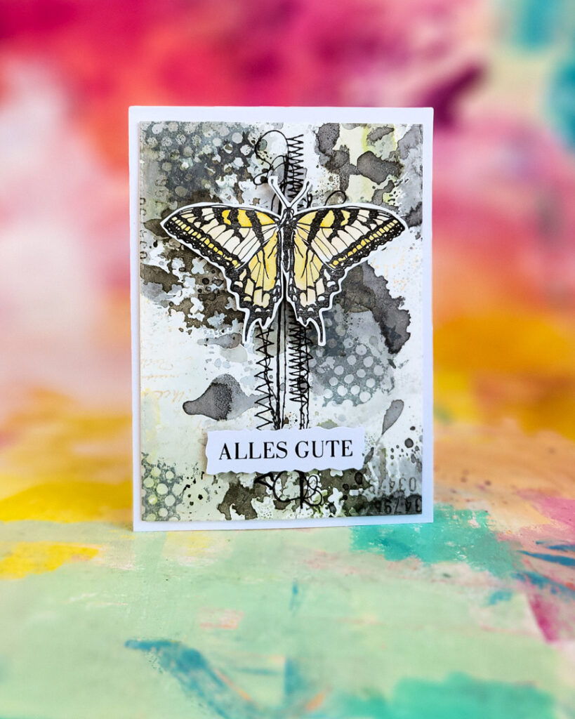 Hi there, Susanne here sharing a greeting card with the Distress Ink backgrounds I shared in last week’s video. I am playing with stamps from Butterflies and Moths, Stitching Borders an a greeting from Kartengrüße.