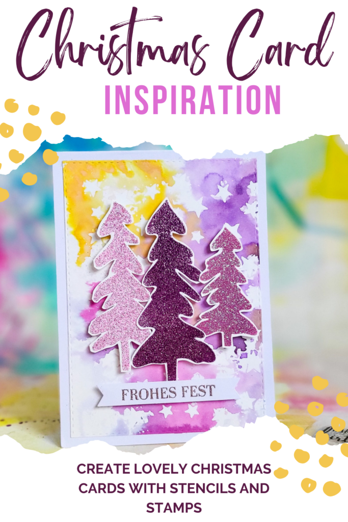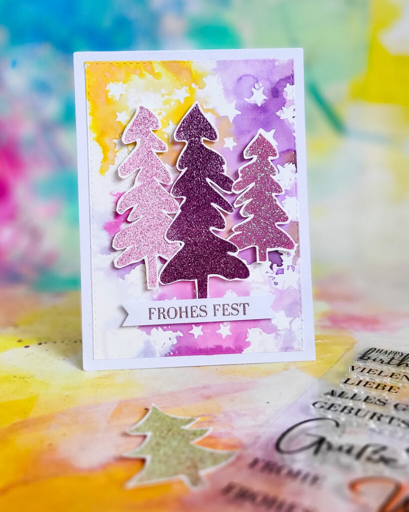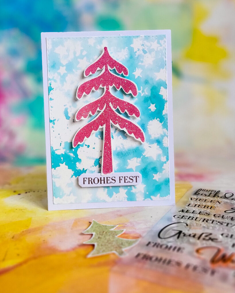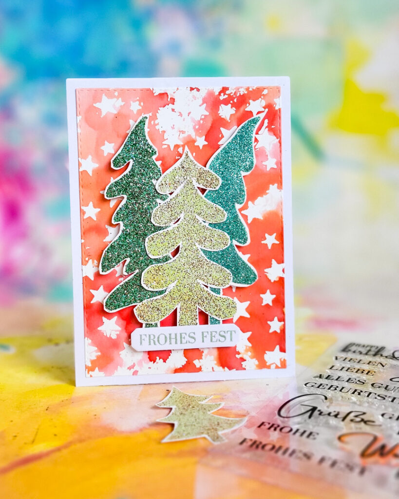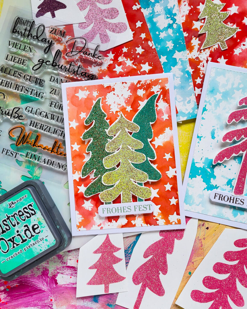 Hi there, Susanne here sharing a Christmas card tutorial. I’m playing with our Stars and XMas Trees stencils together with Distress Inks and embossing powders.