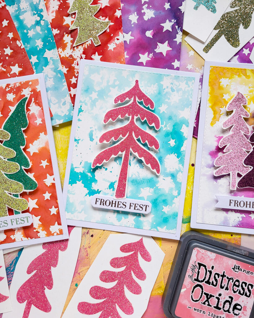 Colourful Christmas Cards with XMas Trees and Distress Inks