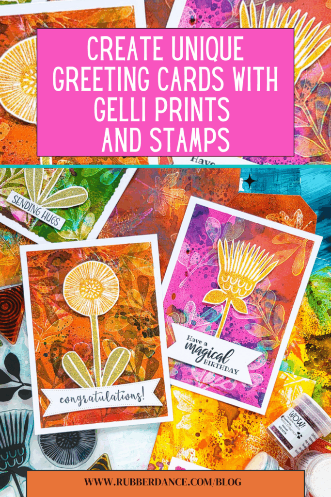 Hi there, Susanne here sharing some bright greeting cards using layered gelli prints (tutorial is linked in the post) together with images from our Carved Collection 6 stamp set.
