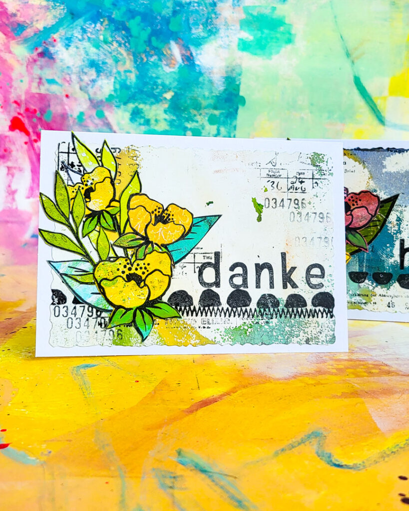 Hi there, Susanne here sharing a set of mixed media cards with a grungy background, using a gelli print and our Mix It Up 7 stamp set, and our wonderful Loose Florals stamps.