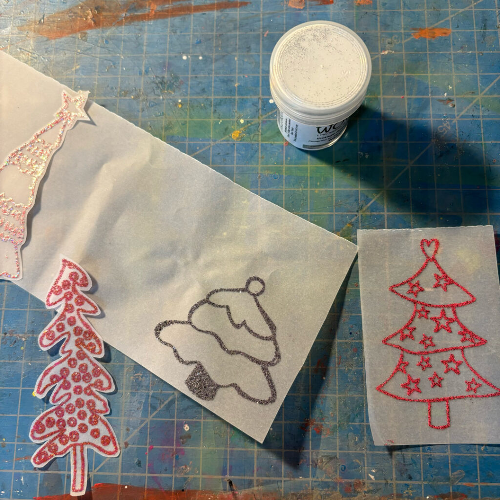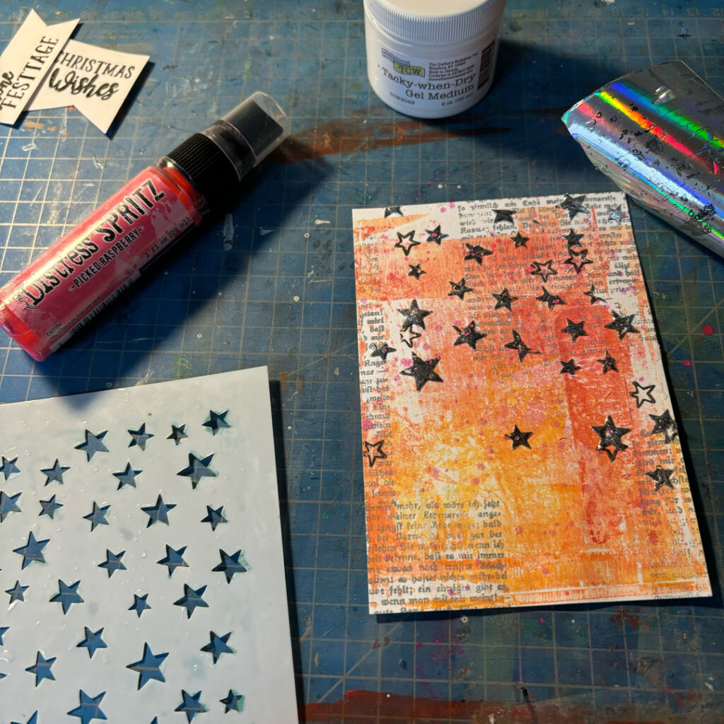 I started by stamping the Textured XMas Trees 2 with an embossing pad on a vellum paper and then heat embossed them with red and pink glitter embossing powder. I then stamped the background that I had once made on a Gelli Plate with a stamp from the Mix It Up 5 set and the Stars from the textured Textured XMas Trees. After that I placed the star stencil on top and painted the “tacky when dry” glue over it and after a short drying time I pressed silver foil onto the stars and peeled it off so that the silver stars remained.