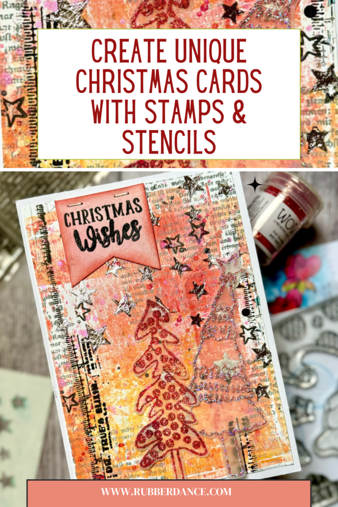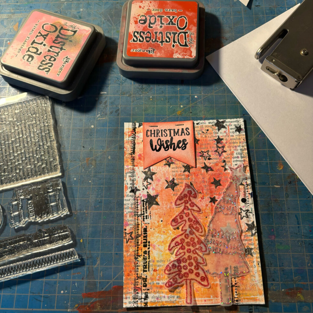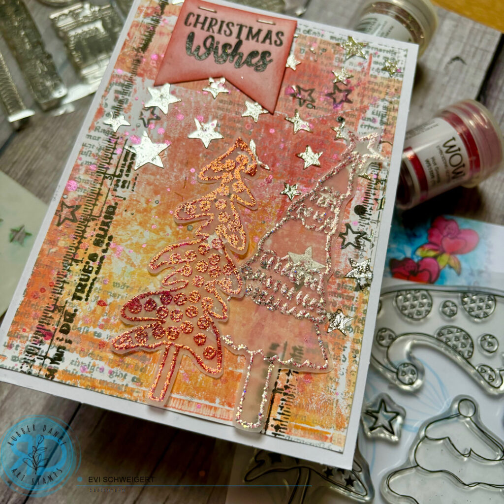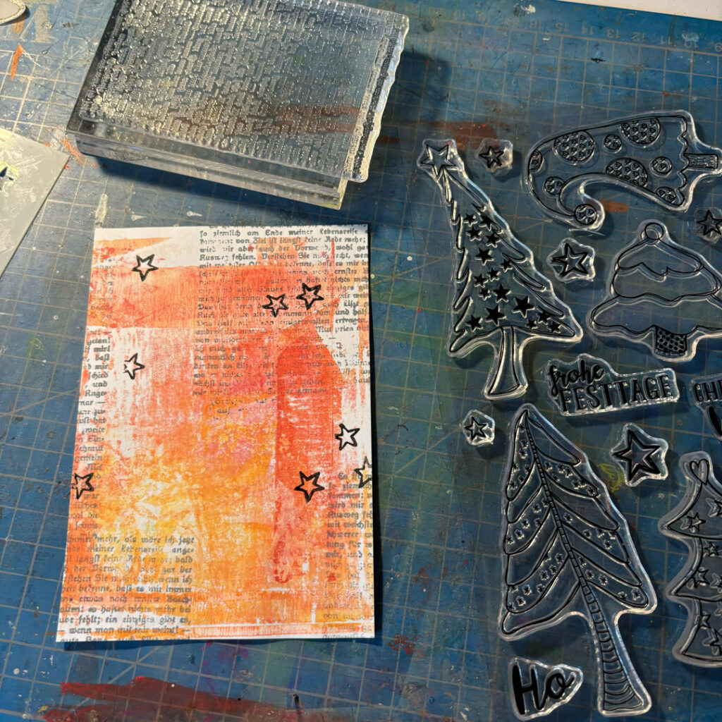 Hello everyone, it’s Evi here and today it’s time for my blog post again. This time I’m bringing you the tutorial for a Christmas card that I designed with a Gelli background, the stars stencil and the brand new Textured XMas Trees 2 stamp set.
