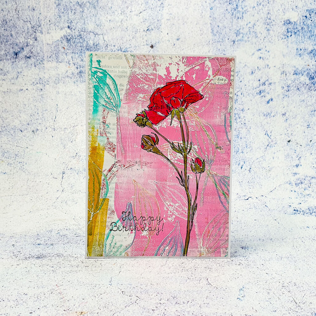 Hi there, Susanne here again. I have some fun cards to share today! For these I used some of my gelli prints. I think gelli printed paper is gorgeous for papercrafting as it is unique compared to the preprinted paper pads you can buy in craft stores. Every print turns out different and it’s another great way to use your stamps. For these cards I simply stamped the images onto the gelli prints, I added a greeting and adhered everything to a cardbase after I’ve die cut it with a nice frame.