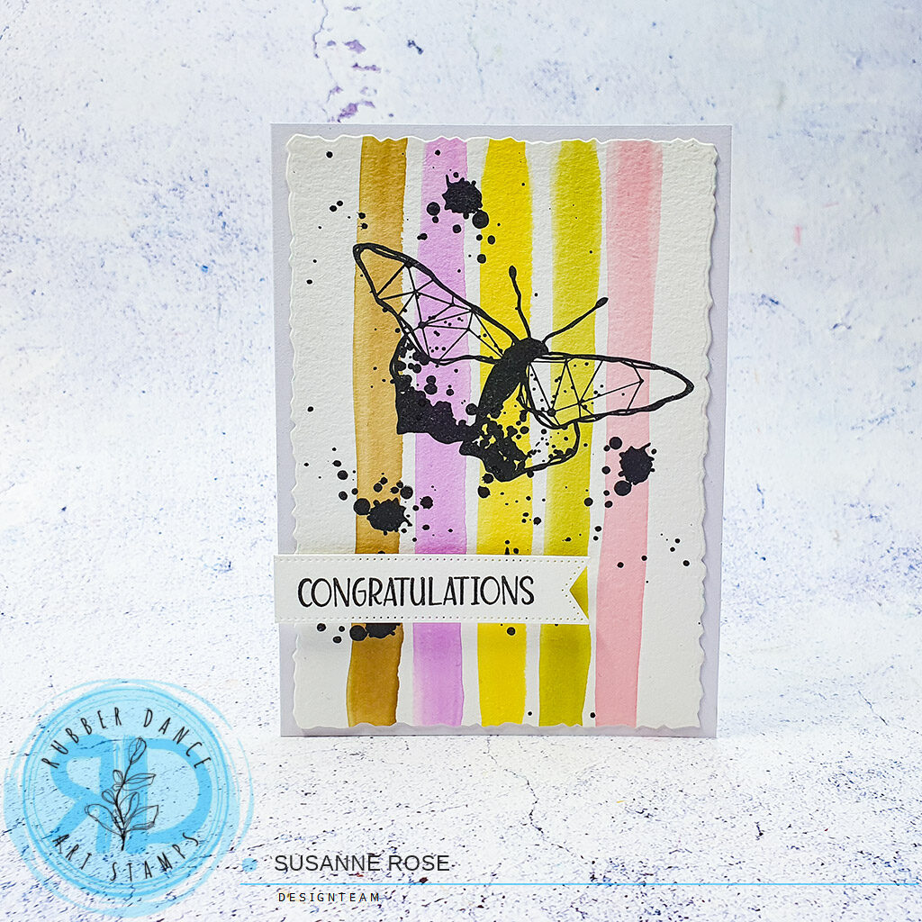 Hi there, Susanne here again. I have some fun cards to share today using stamps from Carved Collection 4 and Grungy Butterflies! For these I made a striped background with two different mediums.