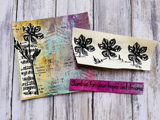 I also stamped a quote onto a strip of pink paper to complement the background, which is a piece of gelli print and added a little bit of background stamping.