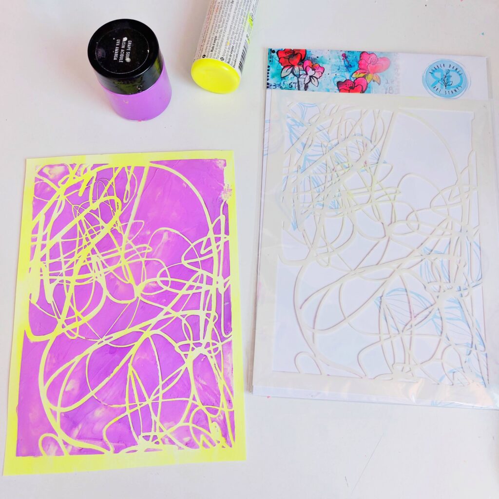 First I made a background of acrylic paint and then I stamped the stencil with a colored texture paste (I loved the color contrast). It is very easy but with this stencil you create very creative backgrounds just by using it.
