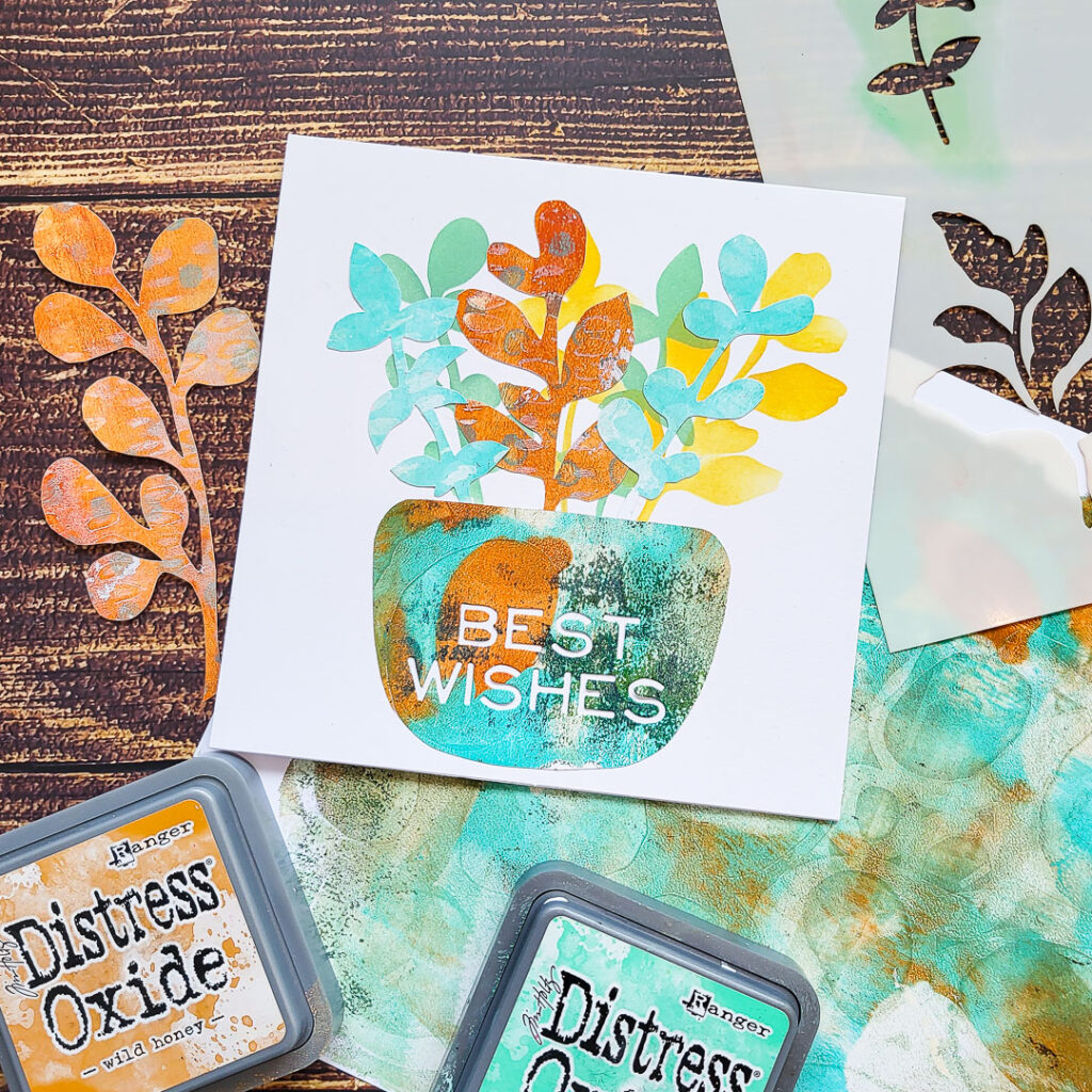 I picked some gelli prints from my stash and some coordinating Distress Oxide Inks. I used a pencil and drew the botanical shapes from Sketchy Leaves stencils to the backside of the gel print. Whilste enjoying some TV I cut out the shapes. I picked a 15cm square white card base and stenciled some of the leaf shapes with the Oxide Inks. I arranged the cut out leaves on top and glued them down. I cut out a flower pot free hand from one of the gelli prints and used a die from Tim Holtz to cut out a greeting. I adhered it to the card to finish it up.