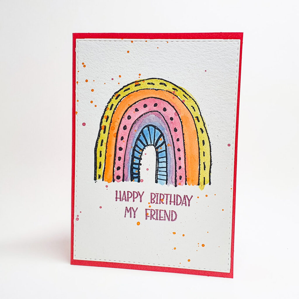 I worked on some watercolor paper and stamped the rainbow with black permanent ink. On watercolor paper Versafine Clair is the best in my opinion. I let the ink dry (just a few minutes) and then coloured the rainbow with metallic watercolors. I stamped the sentiment with embossing ink and used it with some purple metallic embossing powder. Finally I added some orange splatters. I die cut the piece with a stitched frame die and adhered it to a red cardbase. Scroll down for a process video.