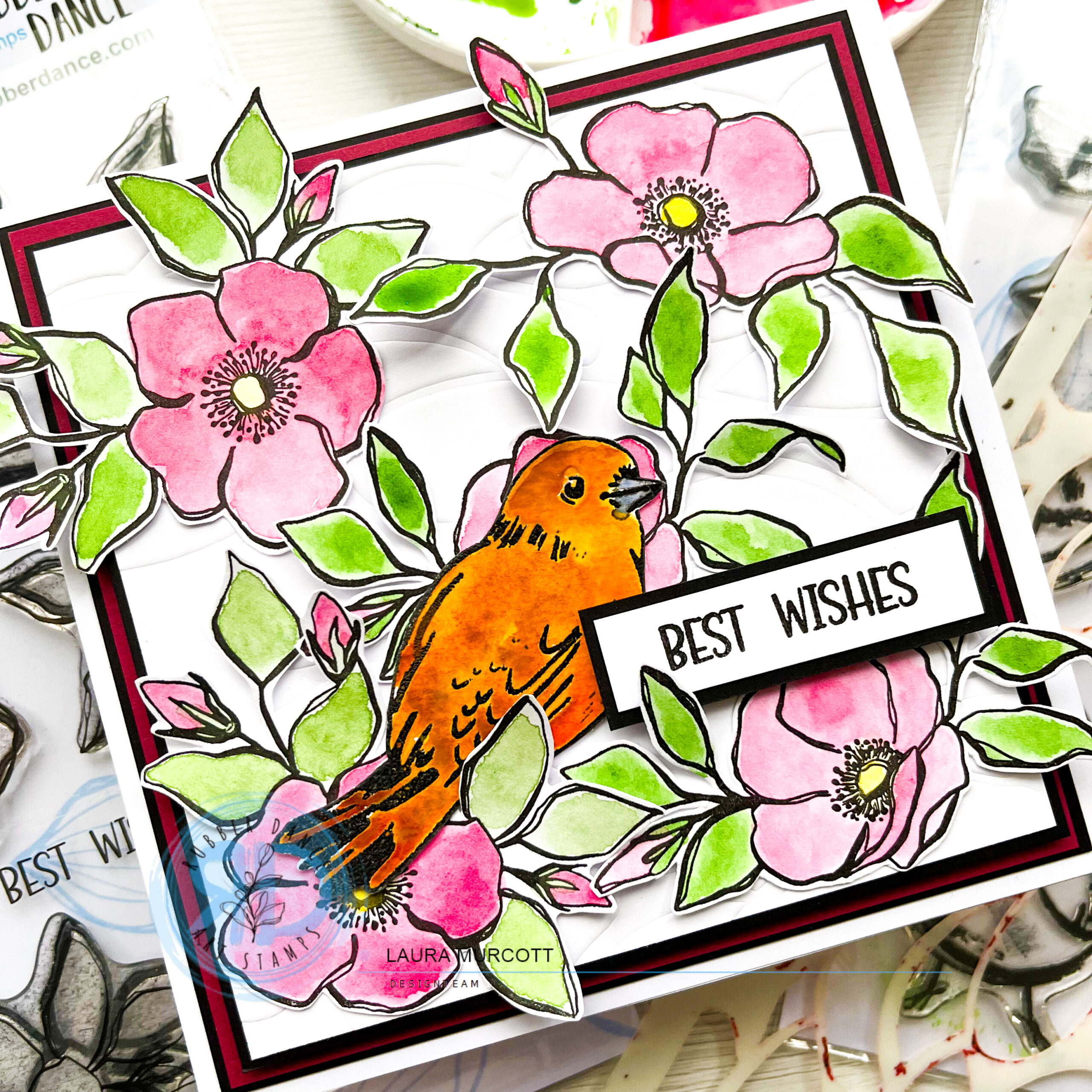 Hi! It’s Laura on the blog today and I’m sharing a card made using the gorgeous Inky Flowers and Sketchy Birds stamp sets. To create a background I simply dry embossed the Organic 3 stencil on white cardstock!