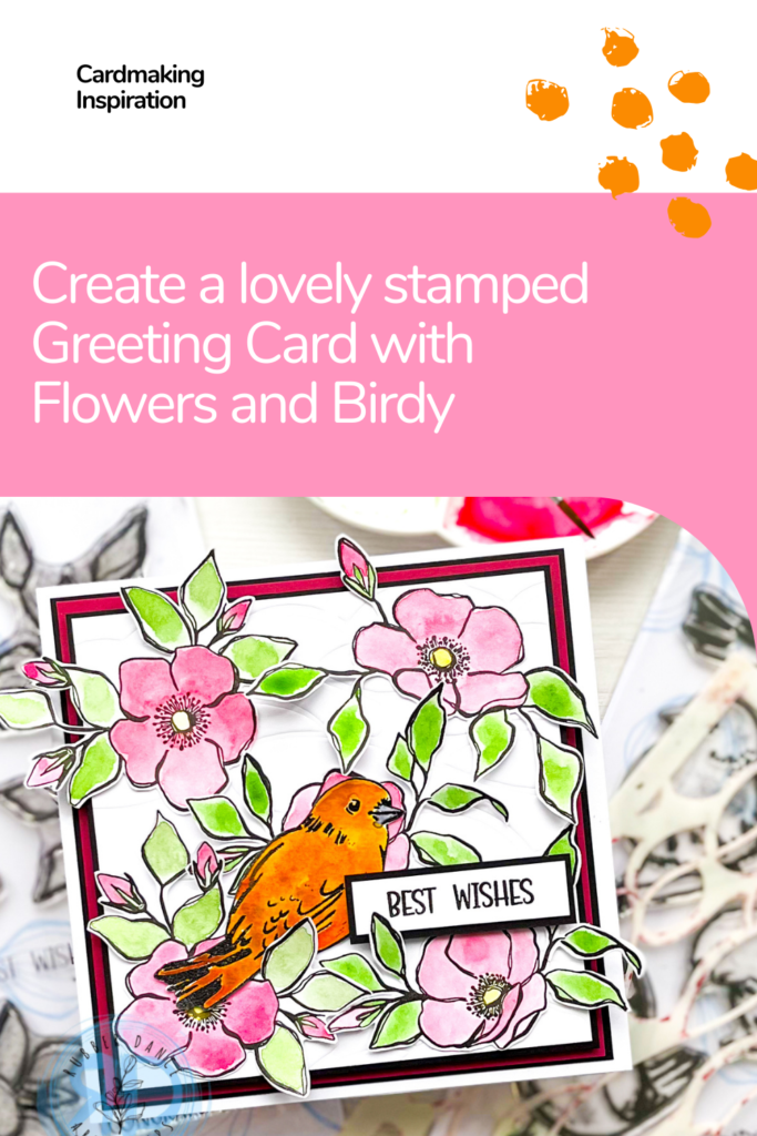 I used the sentiment ‘Best Wishes’ from the Inky Flowers stamp set which I popped on some foam tape. I then placed foam tape behind the black and white panel so that it was popped up and then I attached it centrally on the card base on the cerise layer.