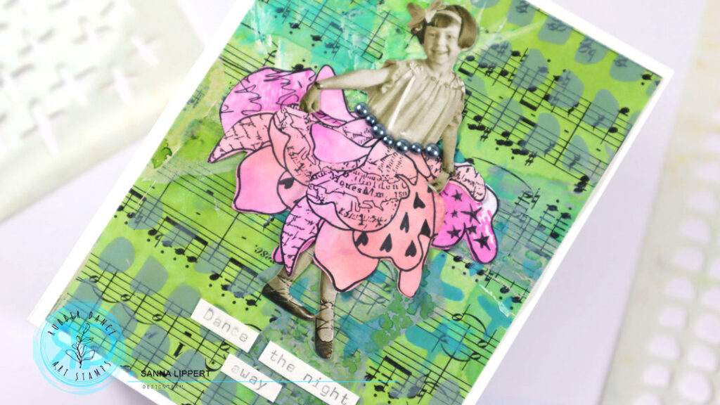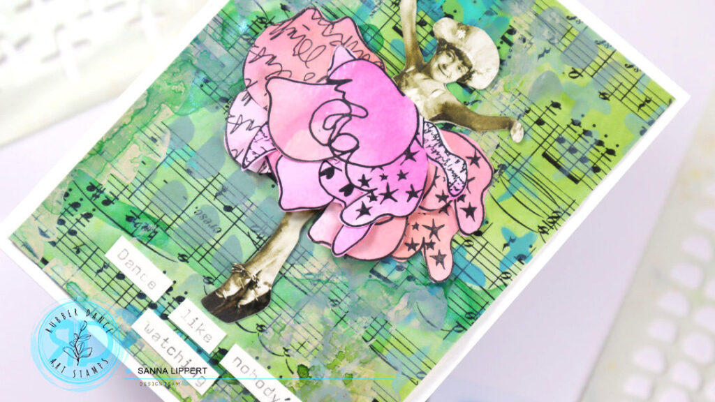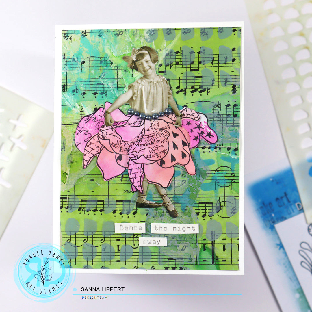 Hi there, Sanna here with two mixed media cards using the Doodle Flowers stamps with a little twist. This is one of my first Rubber Dance stamp sets that I absolutely fell in love with. I wanted to use the flowers in a different way and created pink toned “skirts” with them. For these cards I used the Doodle Flowers stamps with pink toned Distress Inks and Marks 2 and Cross It stencils with Distress Oxide Inks. You will find a video tutorial at the bottom of this post.