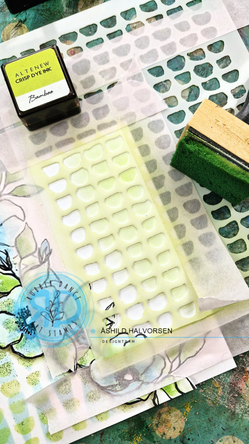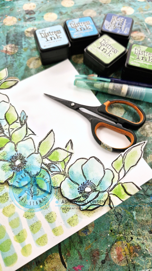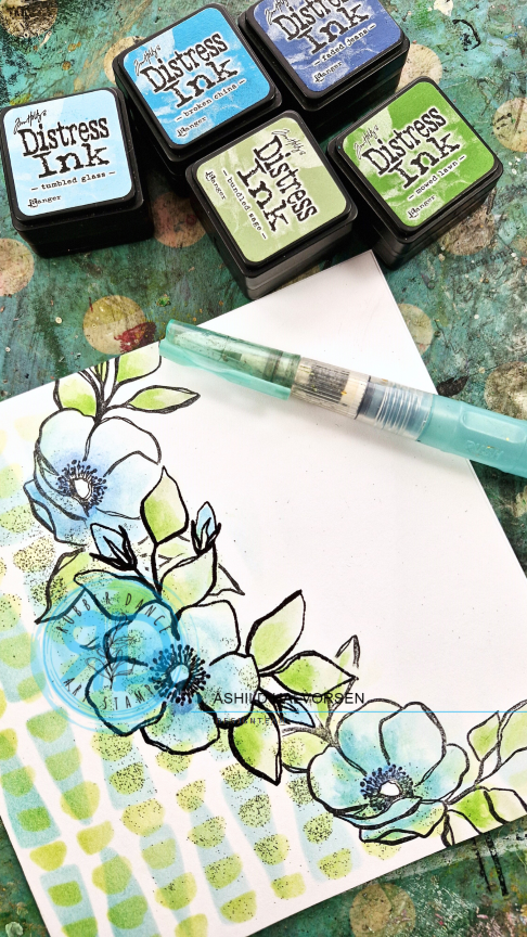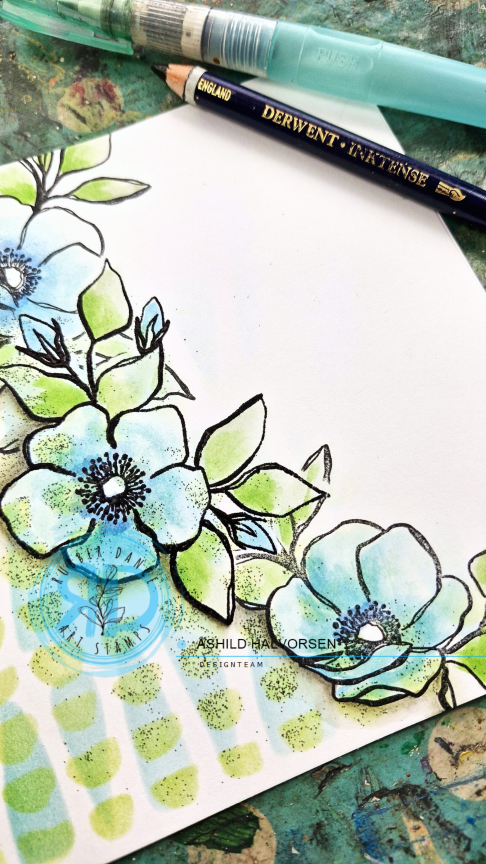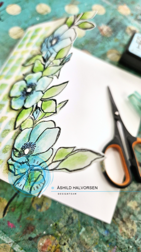 Using the stencils with ink pads and blending tools gives a crips outcome. This card has a special edge – with cut-out-parts of stamped flowers.