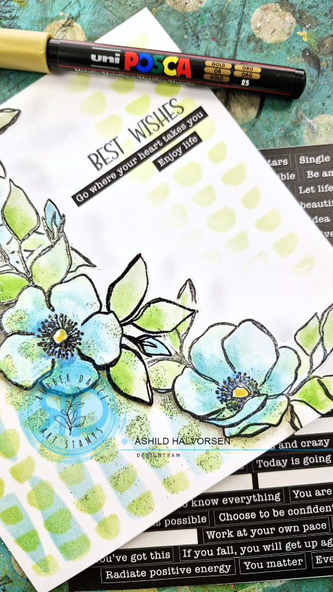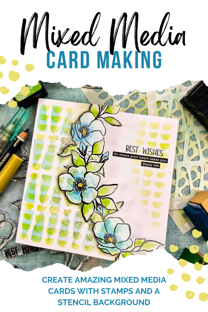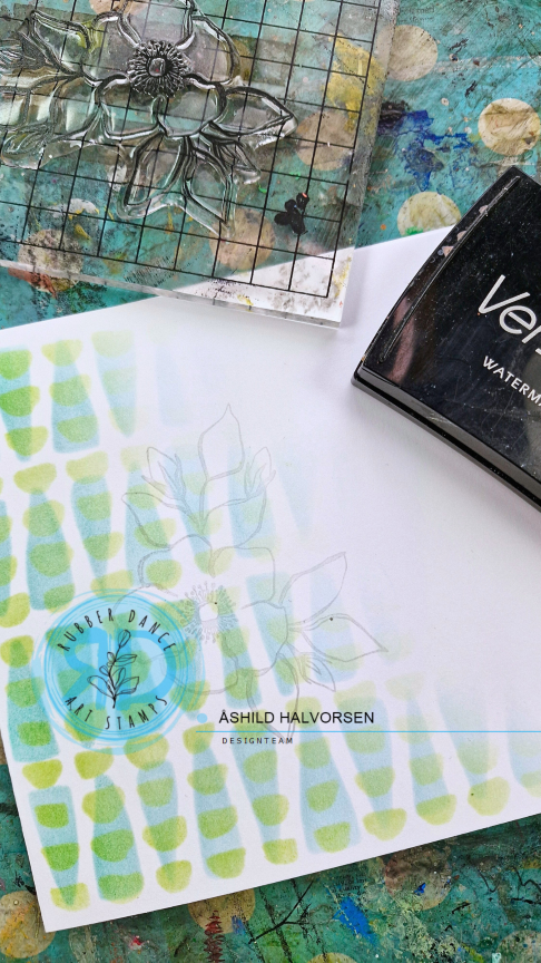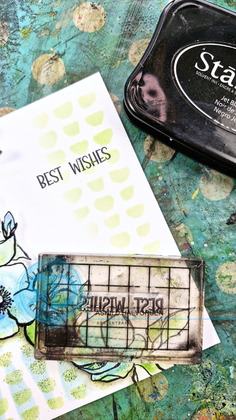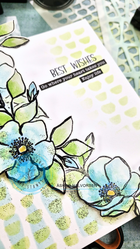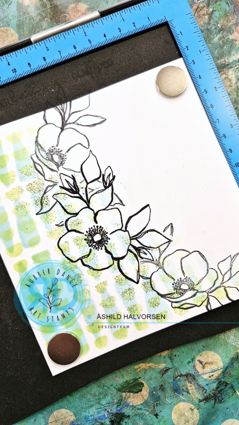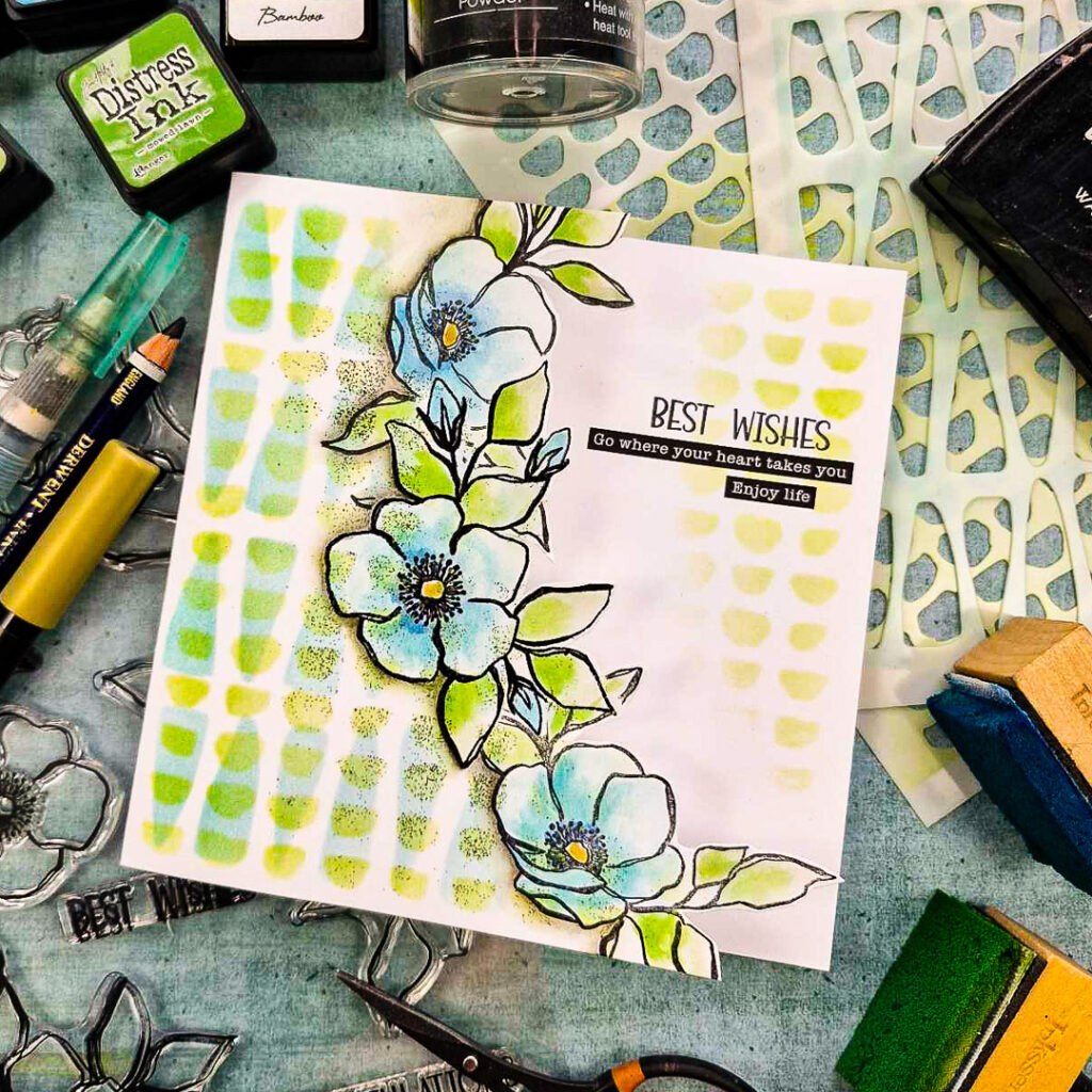 The artsy stencil designs from Rubber Dance are not only perfect for messy mixed media projects. They work so well for a cleaner style too. Today I am sharing a greeting card tutorial using the Marks 2 and Big Triangles stencil for the background. I am using some of the Inky Flowers to create an outstanding focal image!