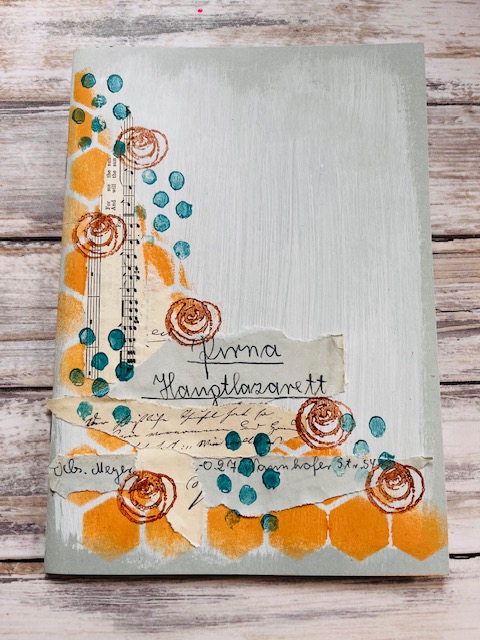 I assembled my stamped elements on the cover, glued them down and added some little punched flowers.