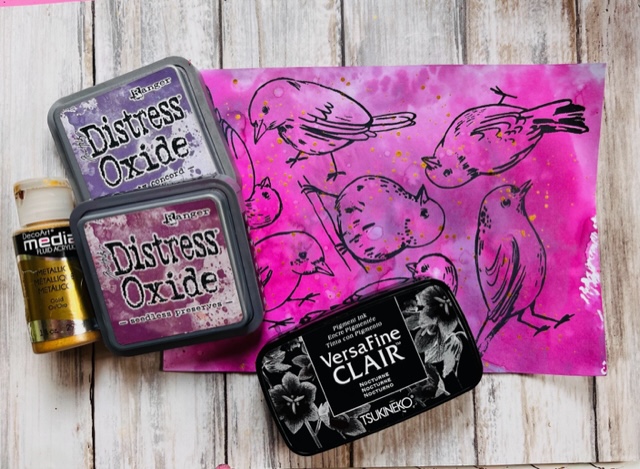 I created a background using purple Distress Oxides and gold paint for some splatter. Once this was dry I stamped some of the birds from the Sketchy Birds 2 set and cut them out. I also stamped the leaves from the Pencil Marks 2 set onto some green scraps of paper and cut them out.