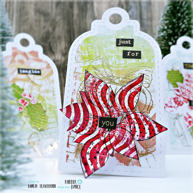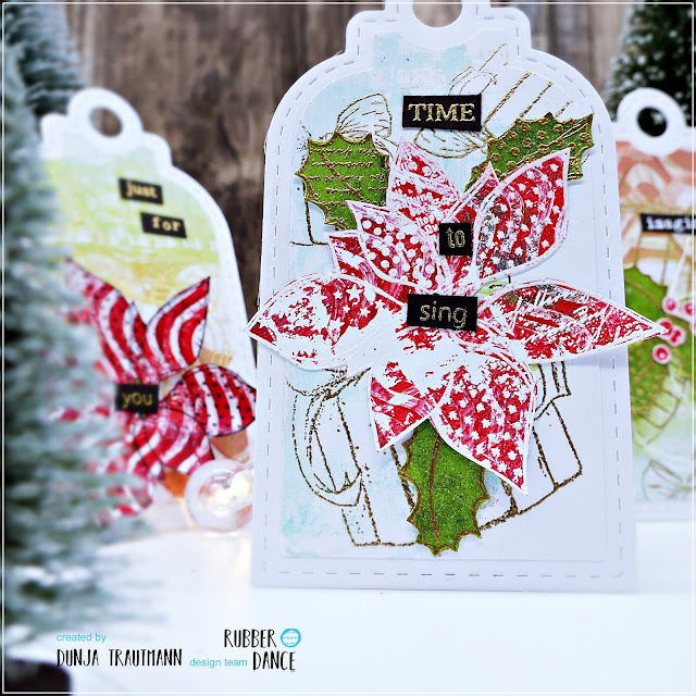 I punched the layer from my gelliprints, the base is white cardstock. I stamped several packages on the cut outs and did some heatembossing with a WOW! Gold Embossing Poweder. For the flowers I used leftovers.