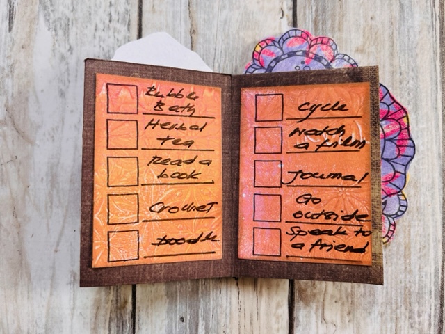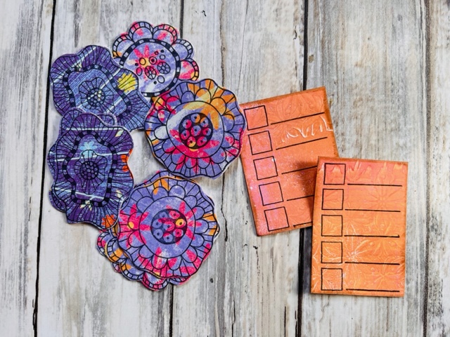 I stamped the list element from the Journal Notes set onto 6 pieces of card to fit the book pages and extended the boxes with some lines. I also stamped some of the flowers from the Crazy Flowers set onto some scrapbook paper, as well as stamping a quote. Then I cut everything out.