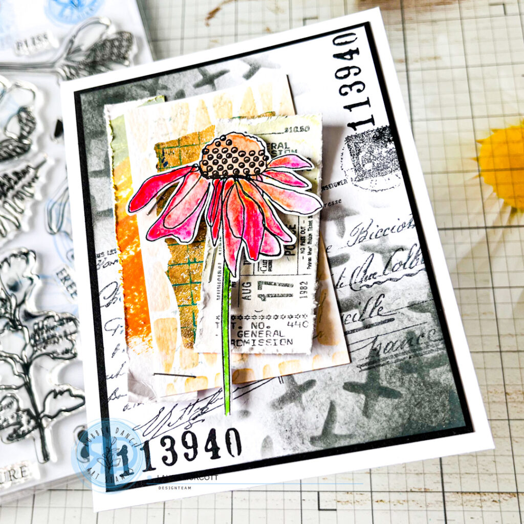 Before I mounted this cluster onto my card I created a background using the Mix it Up 6 stamp set using Distress Oxides in Black Soot and Hickory Smoke. I added some stenciling using the Cross It stencil and some stamping again in black ink. I then could attach my cluster to my card and I chose to leave it sentiment free!