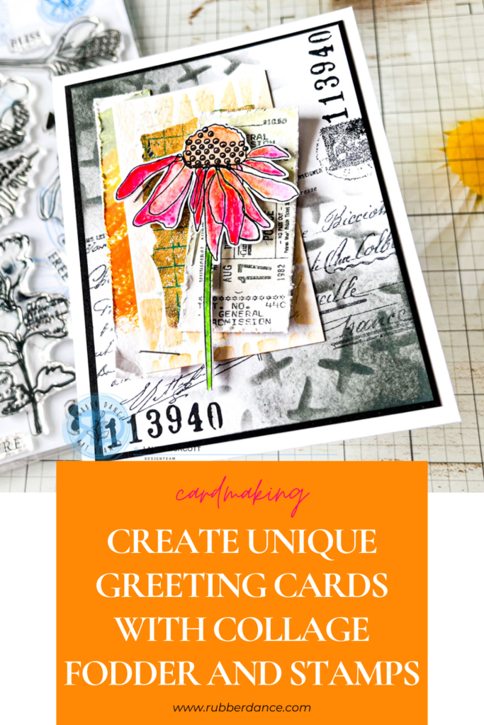 I really enjoyed creating this mixed media card and I love mixing lots of different Rubber Dance products together – they all work so well together! I find limiting my colour palette really helps me to be creative and so once I’ve decided what colours I’m going to use I set about playing. I kept my swatch of colours again and used them as collage fodder on my card – can you spot it?