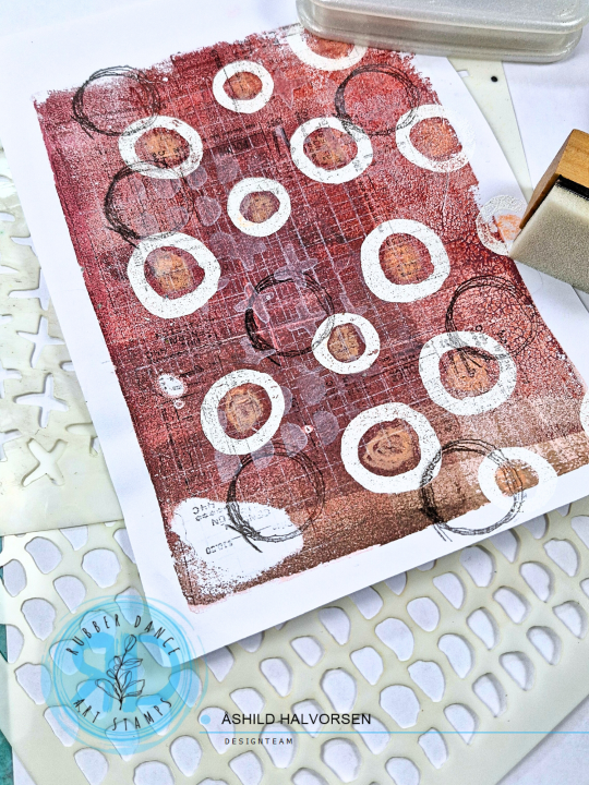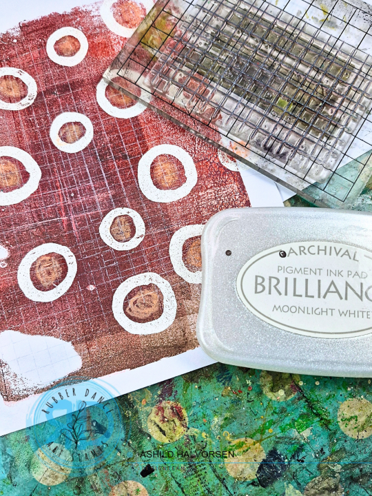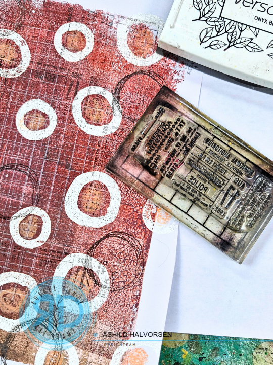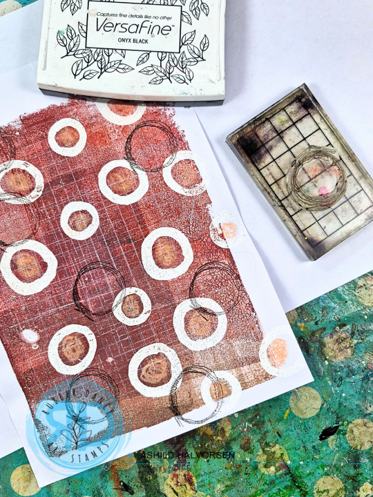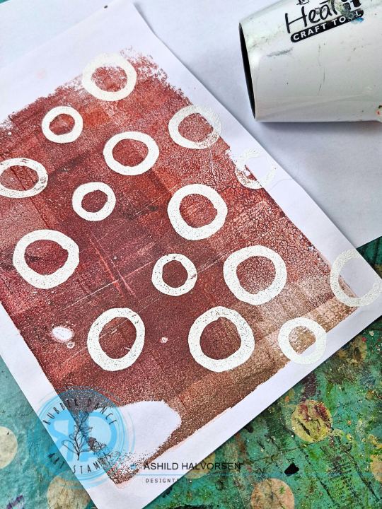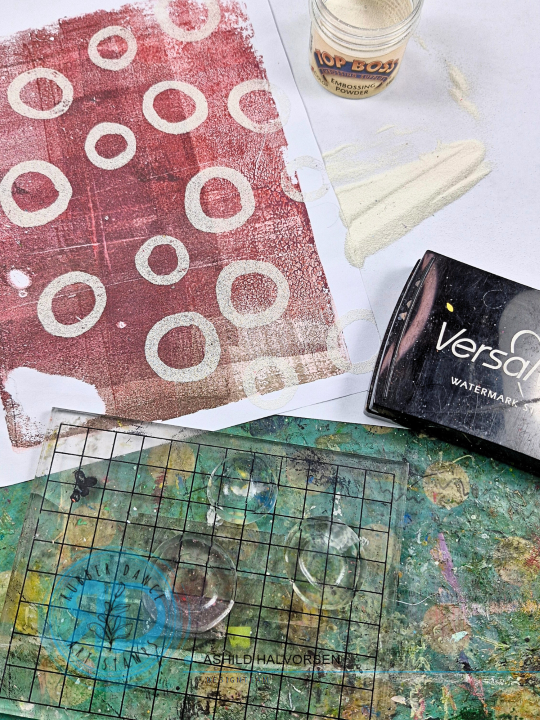 I started by embossing some of the circle stamps with white powder to my gel print.
