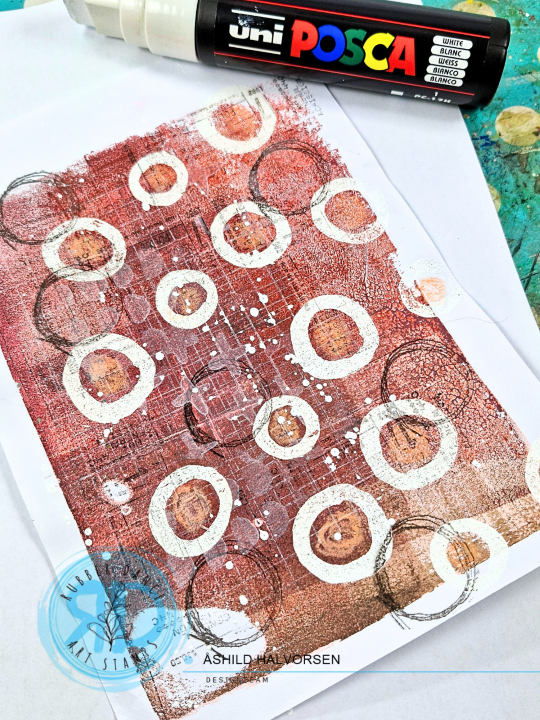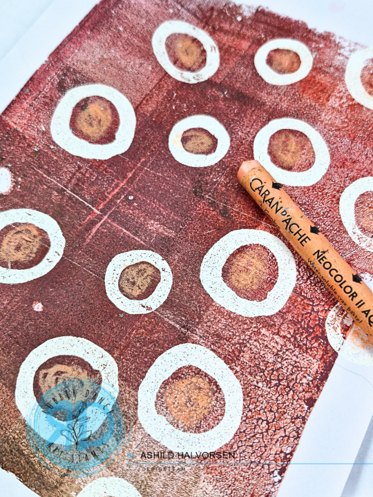 I add some mark making with a Neocolor and stamping to bring more texture to the gel print.