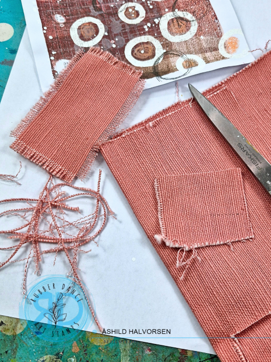 I’ve picked a set of matching papers to play with, and along with collage stamps and stencils from Rubber Dance and some fabric scraps, I’ll show you how I made this monochromatic card.