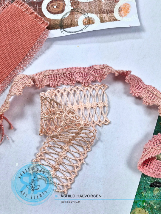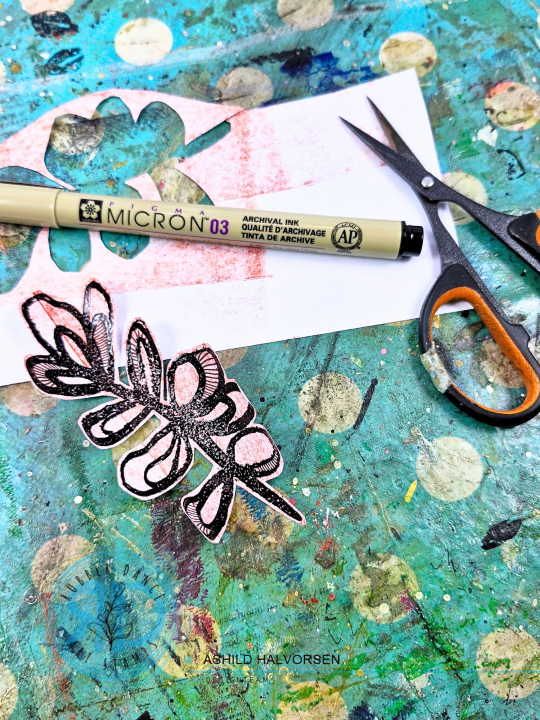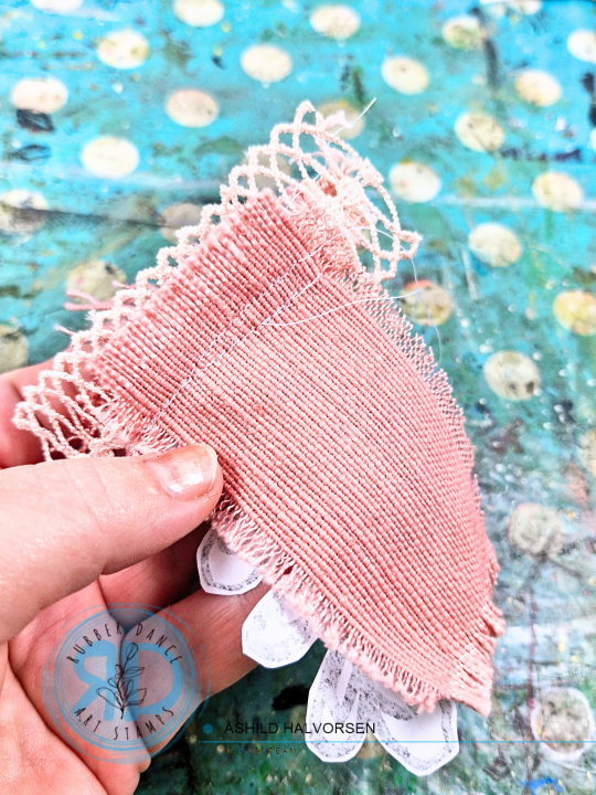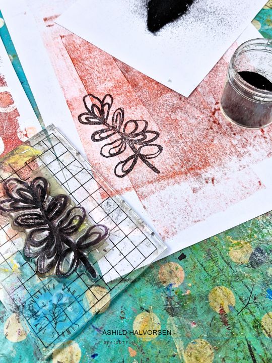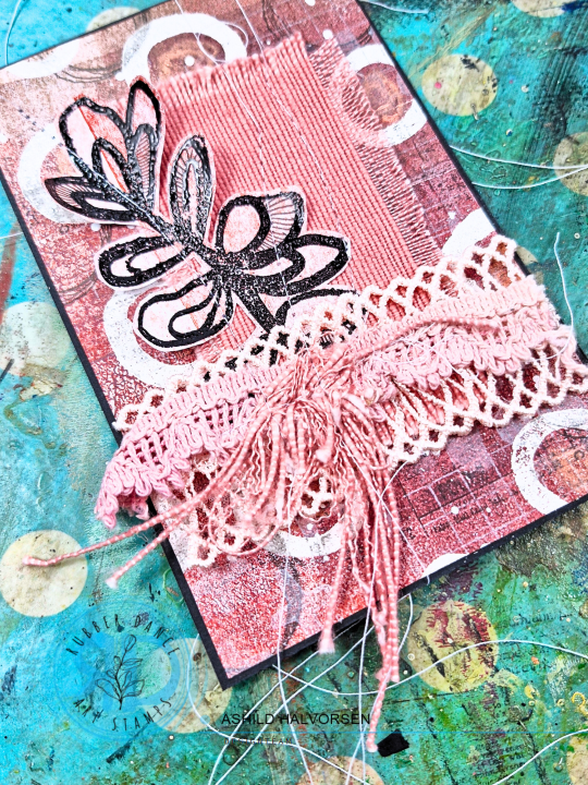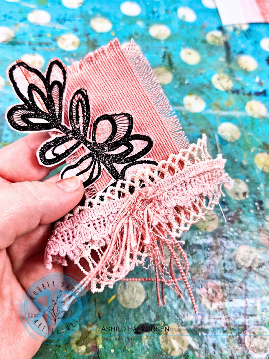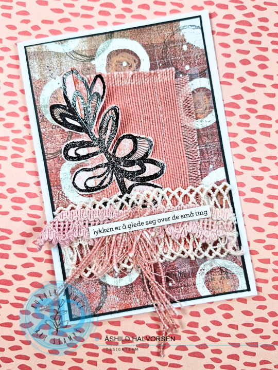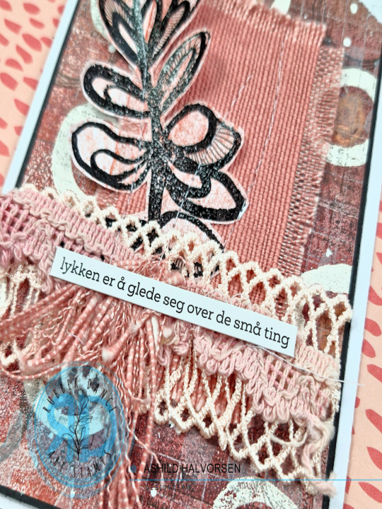For some dimension I am adding some ribbons and a piece of farbric and I am stamping the leaf from Pencil Marks 7 with black embossing powder to create a focal image. I am stitching everything together and place it, together with the gelli print, onto a card base.