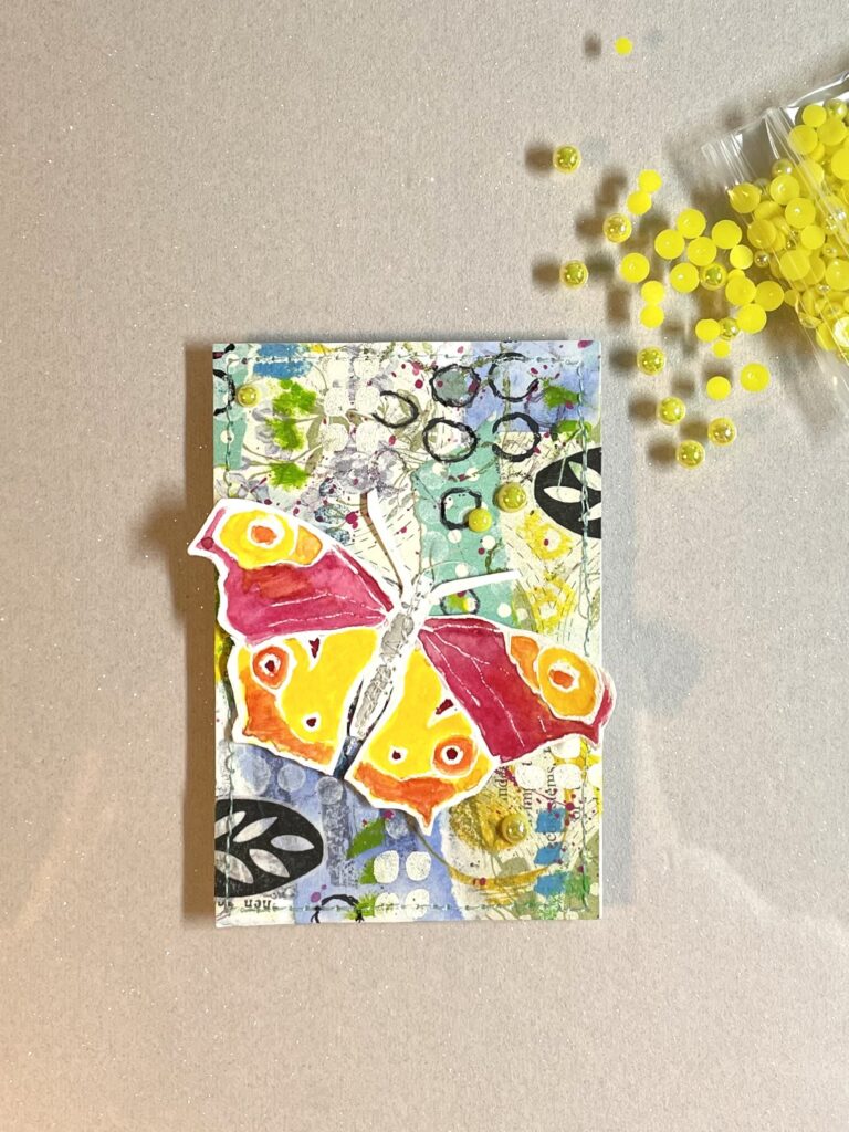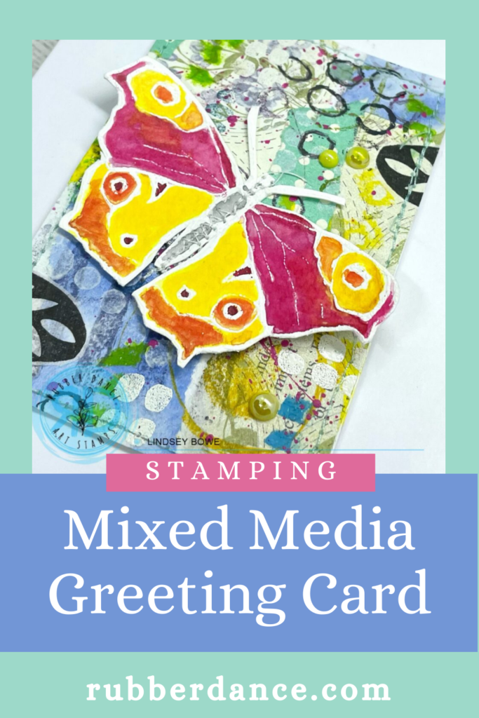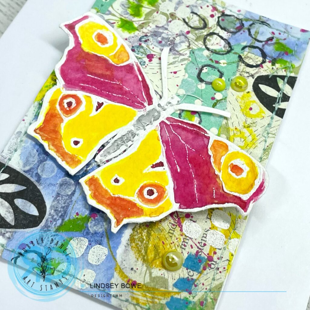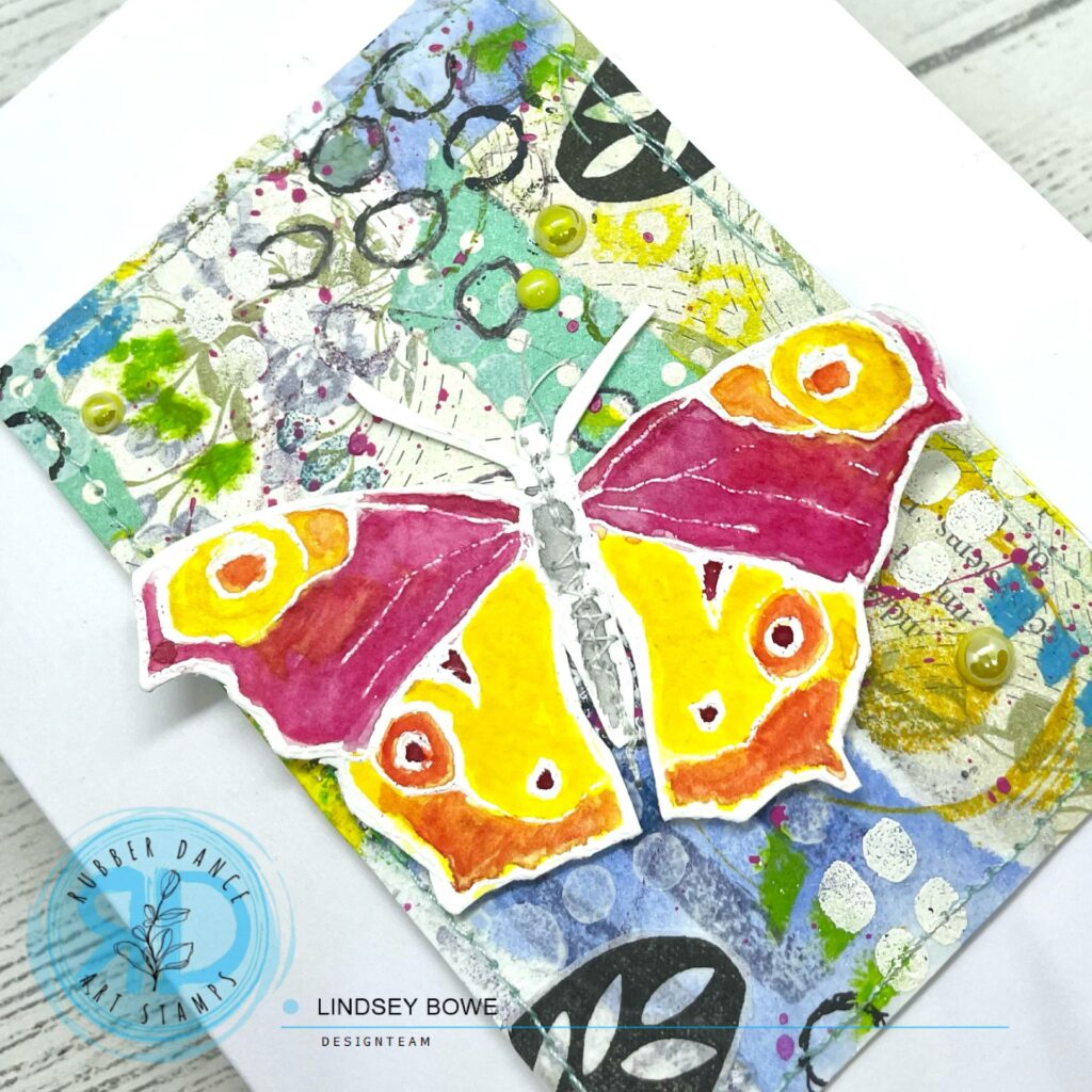 Happy Tuesday! Lindsey (@doodlings_cards) here with a quick and easy mixed media card for you using a butterfly stamp from Inky Friends combined with a colourful mixed media background. I adhered my final card to a greeting card base, but I could also have used it as an artist trading card (ATC).