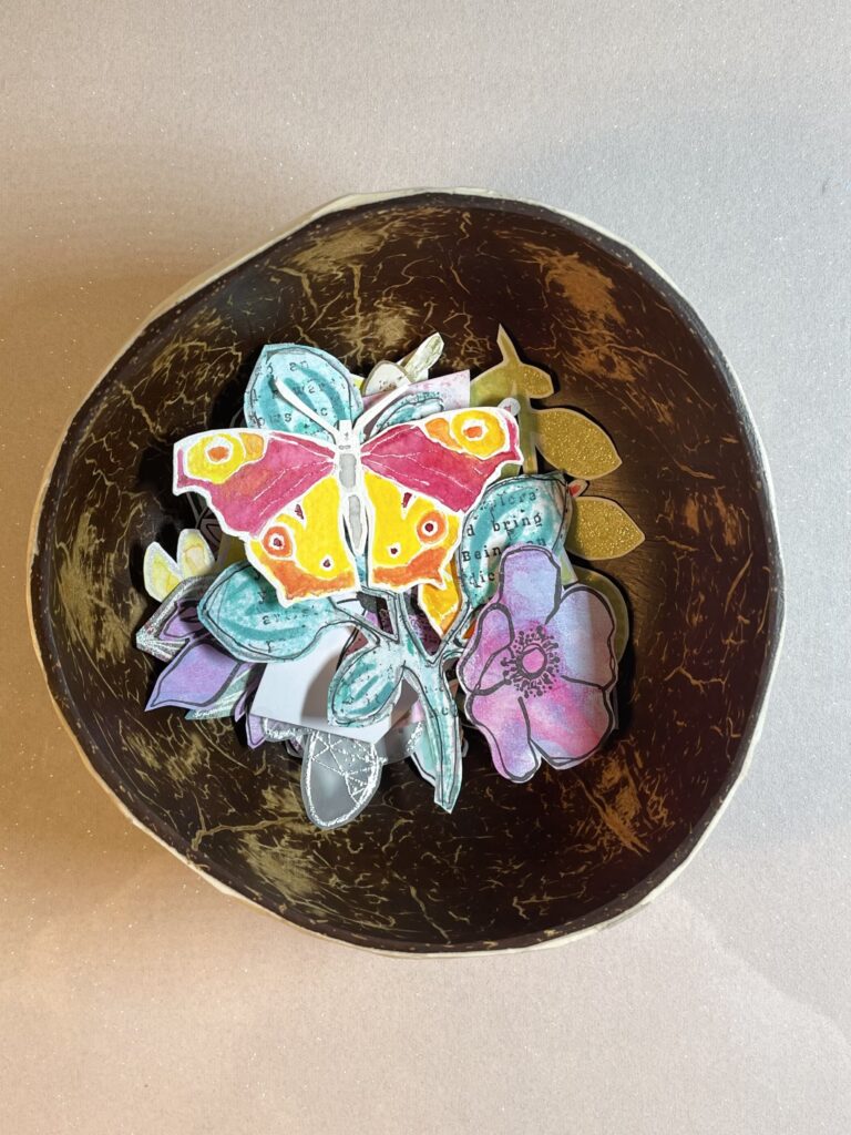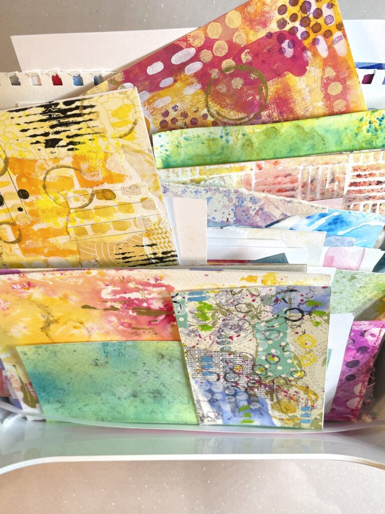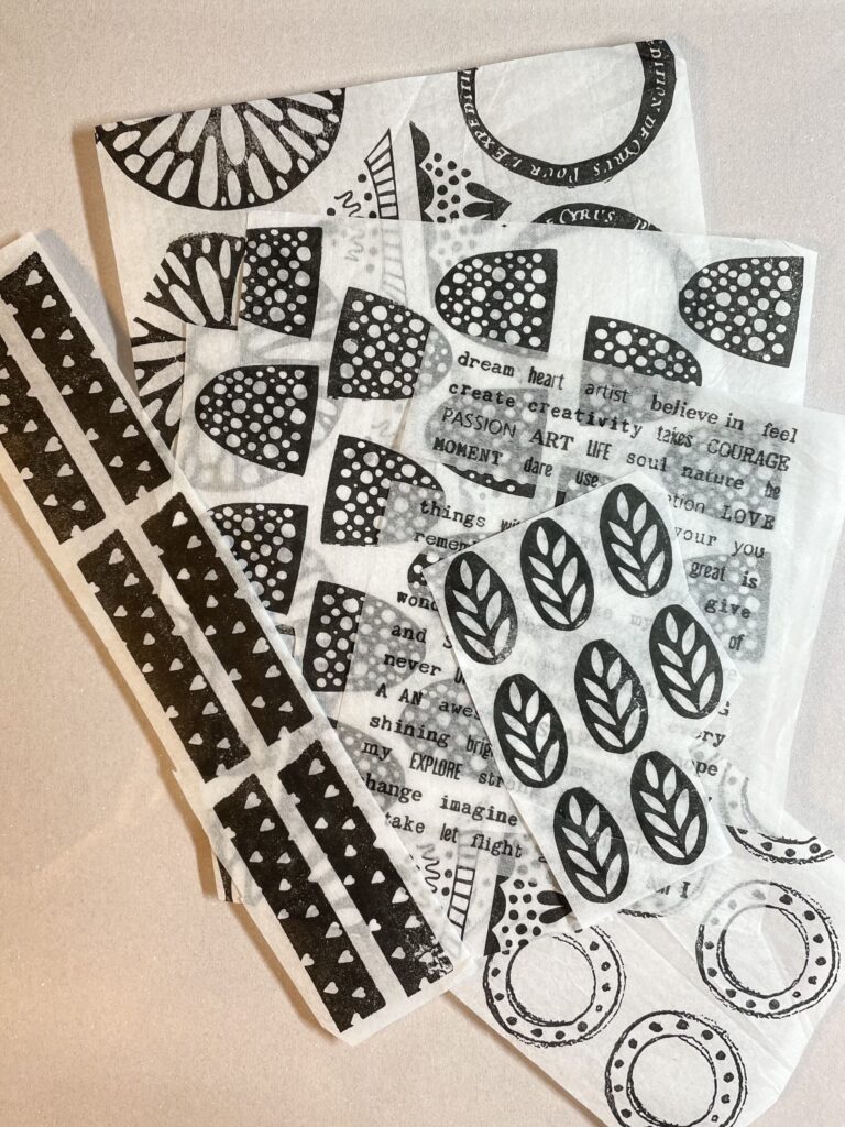 I turned to my stash of pre-prepared focal elements and pre-stamped tissue papers😊