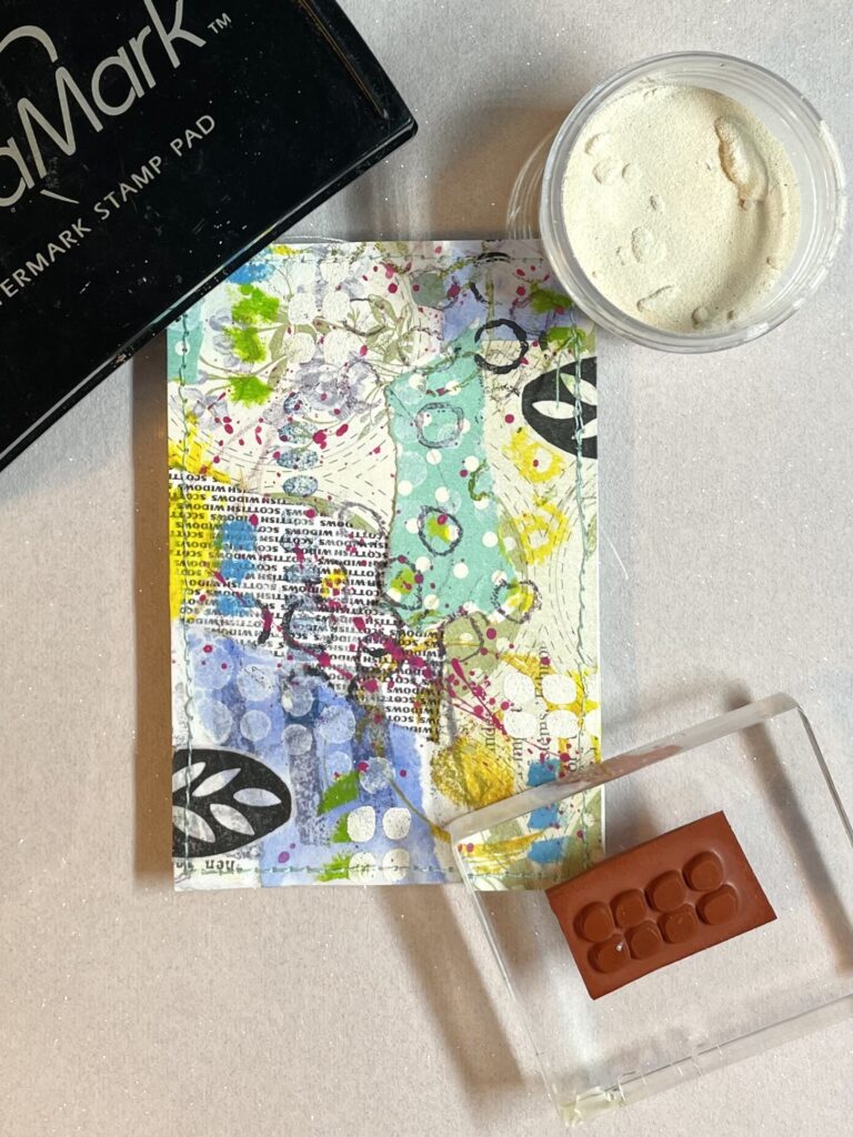 I picked a background from my (never seemingly decreasing!) pile and added a bit more interest with stitching around the edge and a couple of heat embossed images with a stamp from the Mixed Media Marks 1 set.