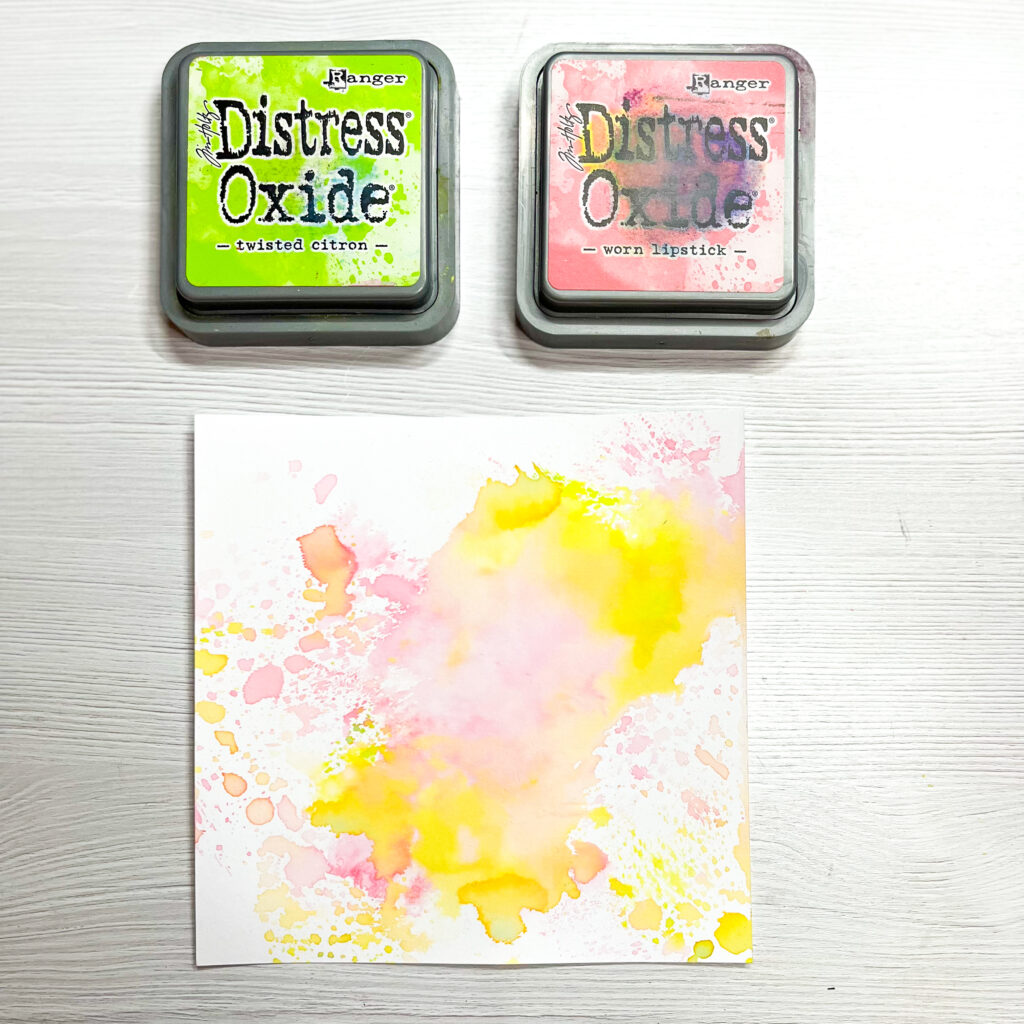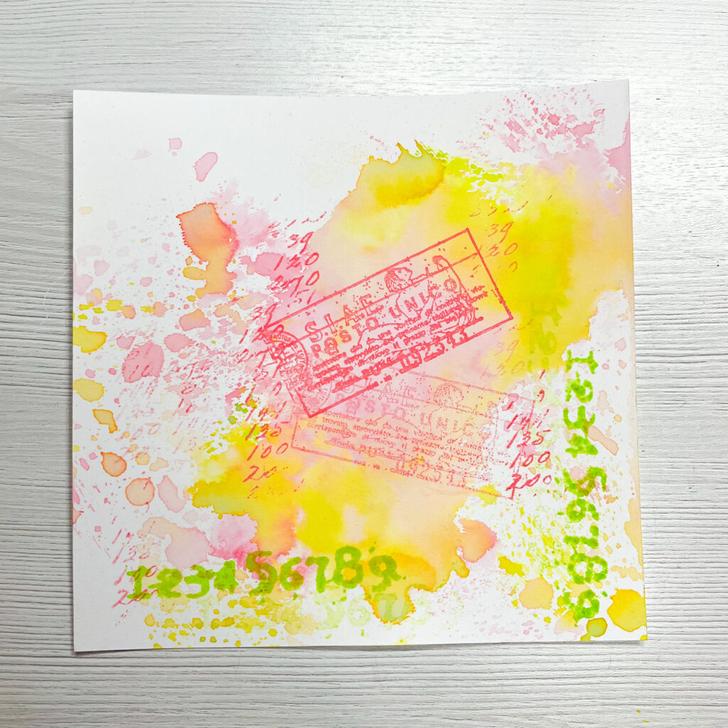 First of all I created my background. I used Distress Oxide inks in Worn Lipstick and Twisted Citron and I simply ink smooshed the colours onto my background. I added one colour at a time to avoid making ‘mud.’ Once the panel was dry I added some stamping using the Mix it Up 1 stamp set to add some interest to the background.