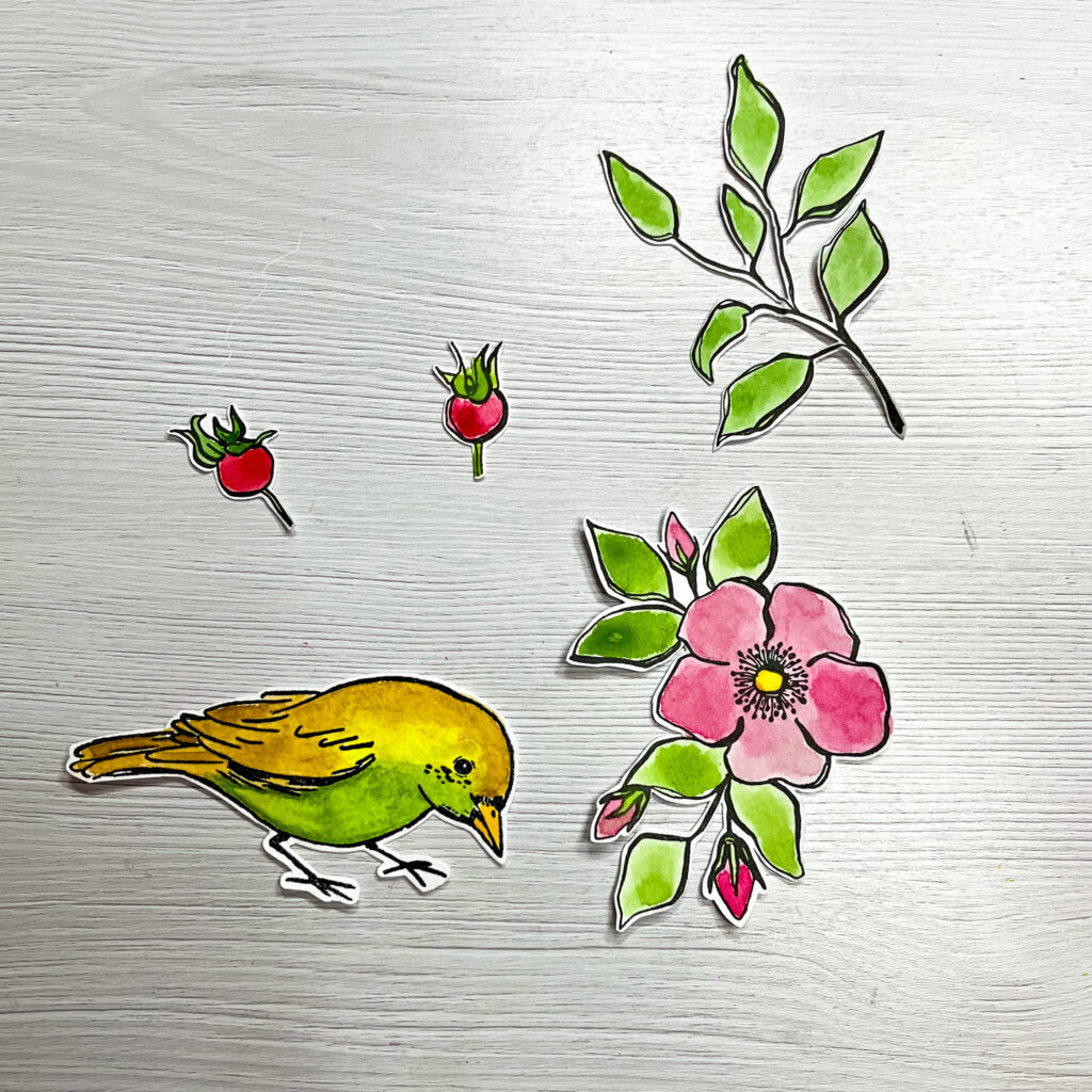 I stamped some of the Inky Flowers and a Sketchy Bird on some watercolour cardstock using VersaFine Onxy black ink and then I water coloured the images. Once they were dry I fussy cut them out.