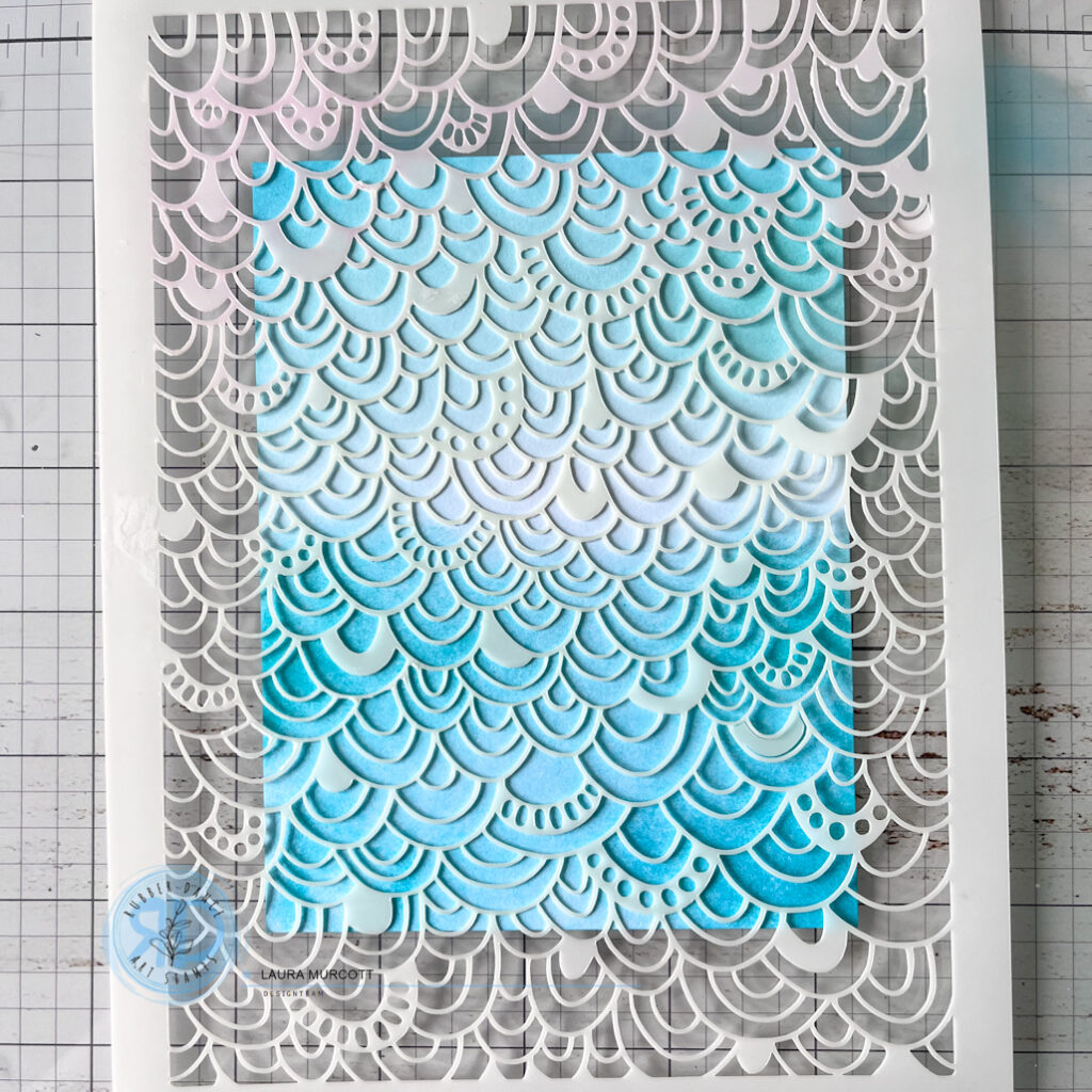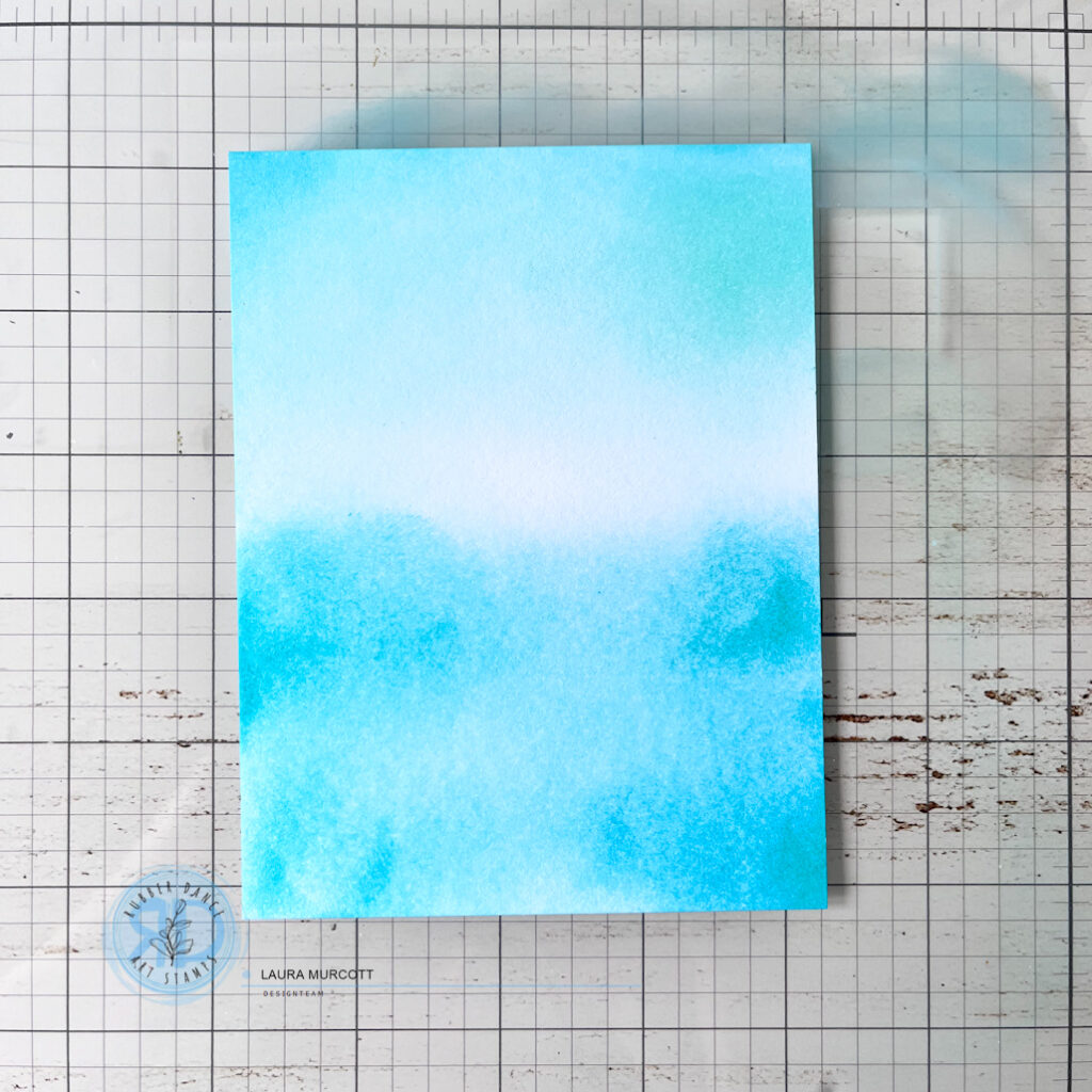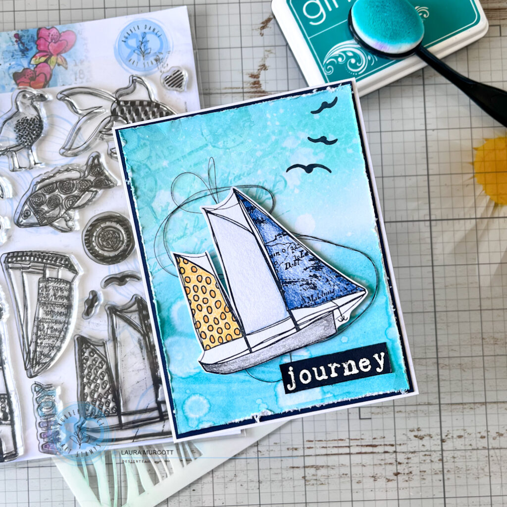 I like to add layers and texture to my cards to add interest and to create something unique. I have put some step by step photos below of how my project came together. First, I added some ink to a card panel. I used blues and teals to go with my sea them. Next I added some detail using stencils. I like to use the same inks that I’ve blended with so that we aren’t adding any new colours at this stage, just some texture. I used the Rainbows 2 stencil for some sky detail and the Organic 2 stencil for the waves of the sea.