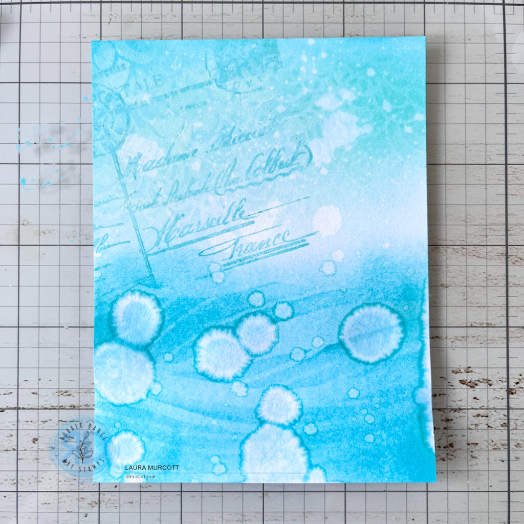 Next I added some water splatters to cause the inks to react. Once it was dry I then used the Postcard Stamp from Mix it Up 6, again using the same ink colour, to add some subtle stamping.