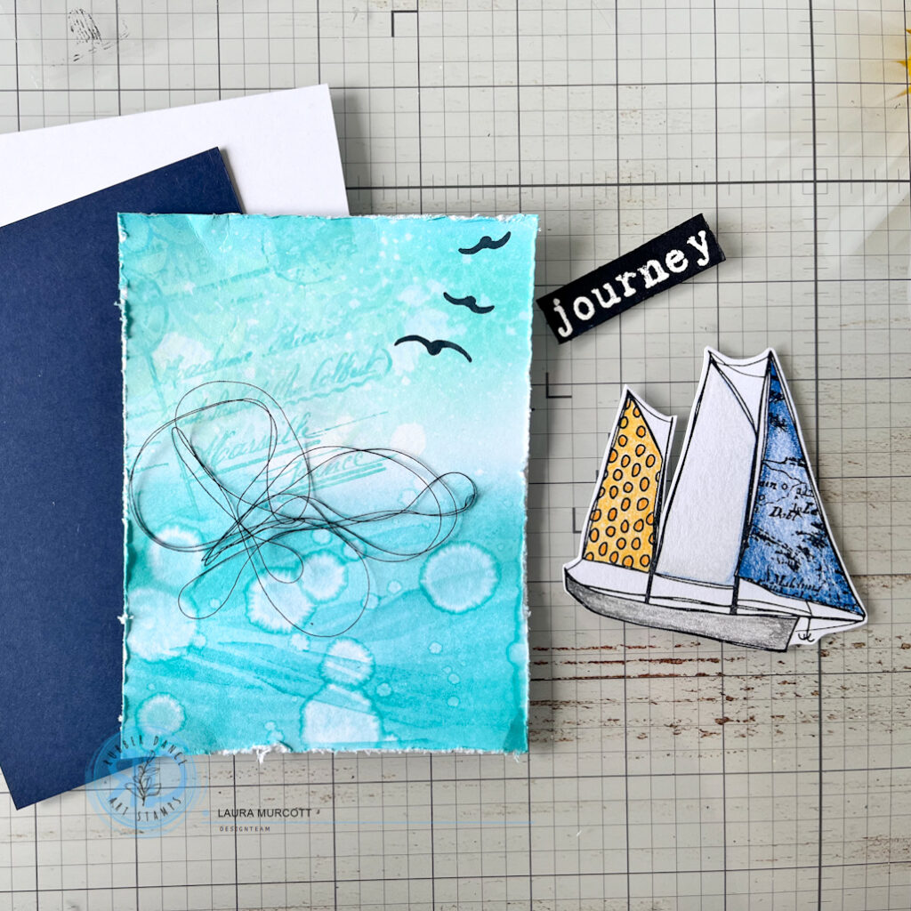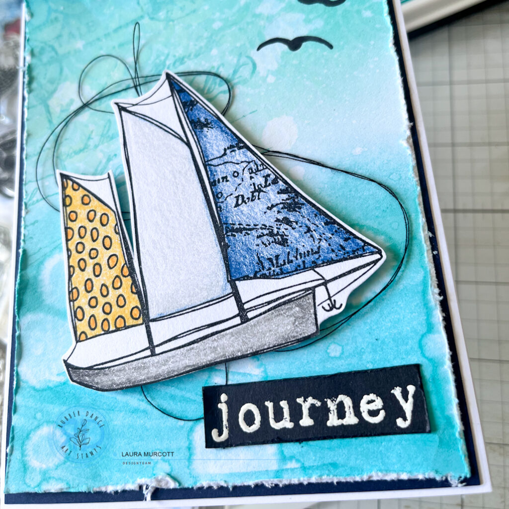 I stamped my focal element from the AHOY stamp set and coloured with with coloured pencils and fussy cut the image out. I added some birds in black ink to the skyline and I distressed around the panel using my scissors. My sentiment white heat embossed on black cardstock which I then also distressed with my scissors. I added some black cotton thread and popped the boat on some foam tape for some dimension. I grounded it on a layer of navy blue cardstock and then I mounted it to my top folding card base.